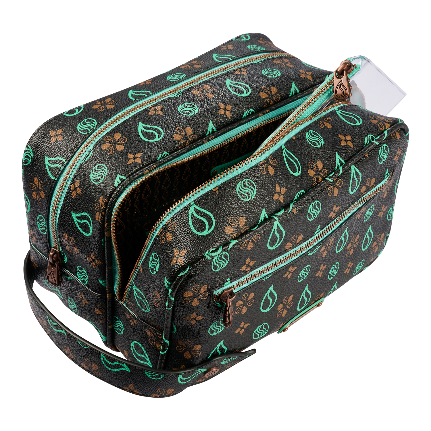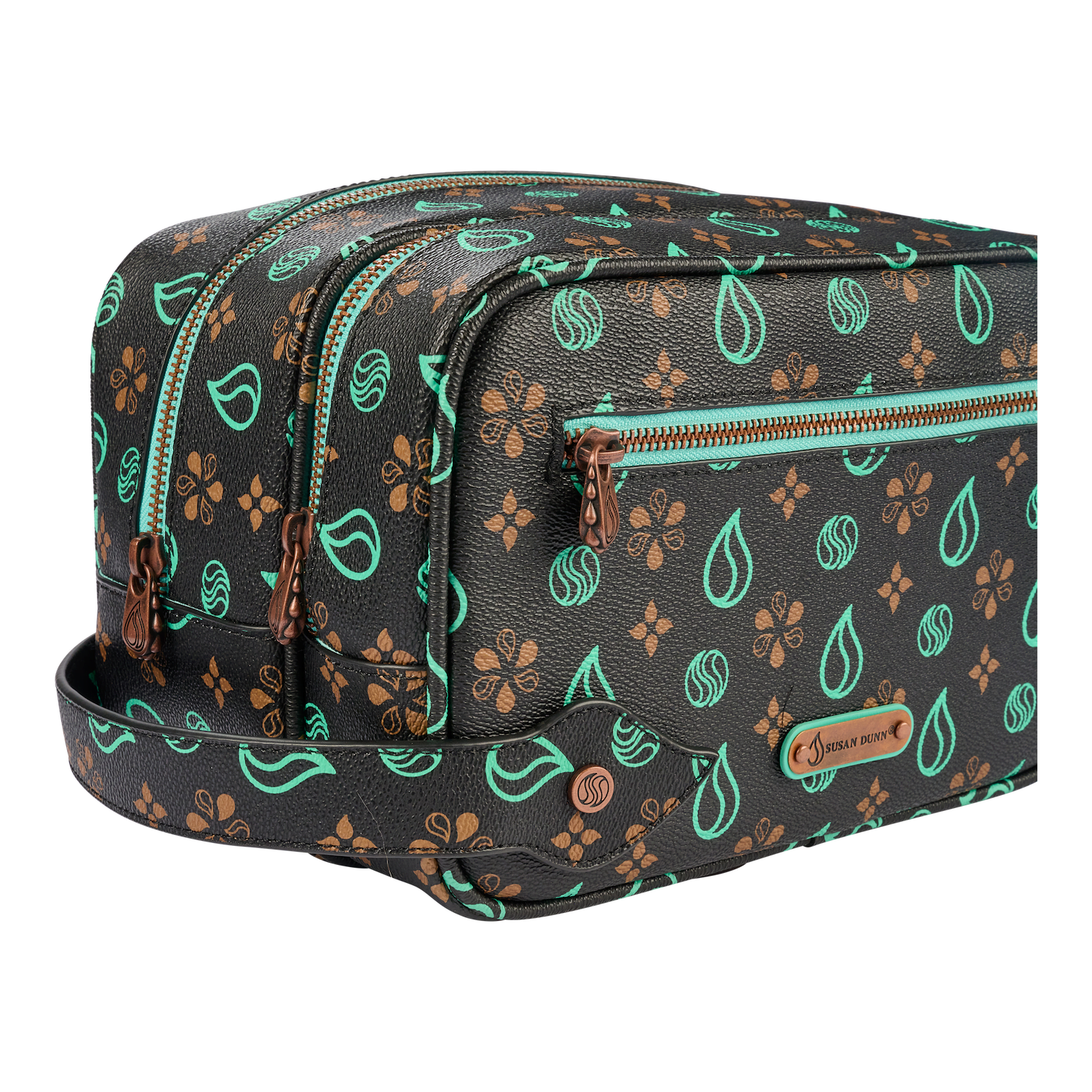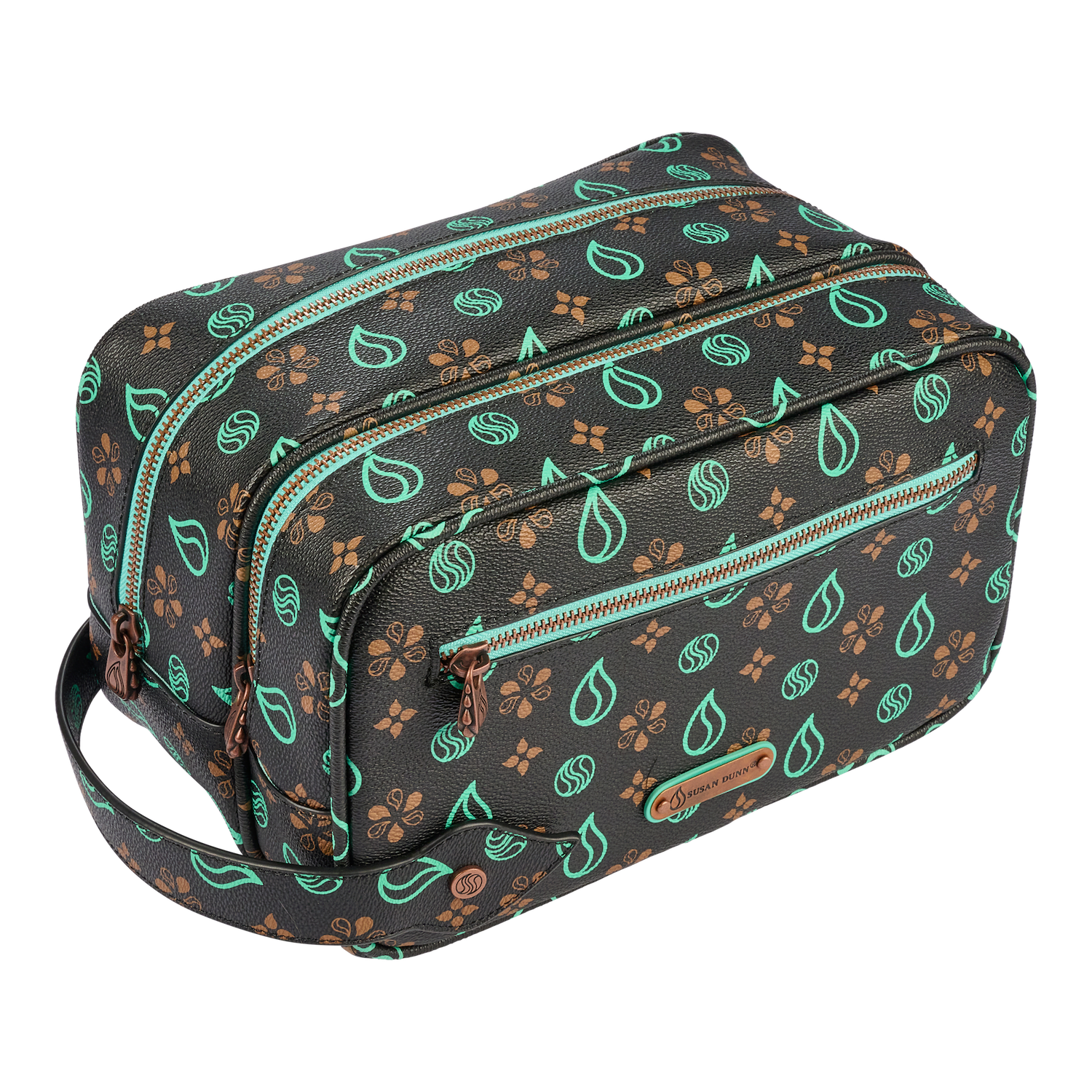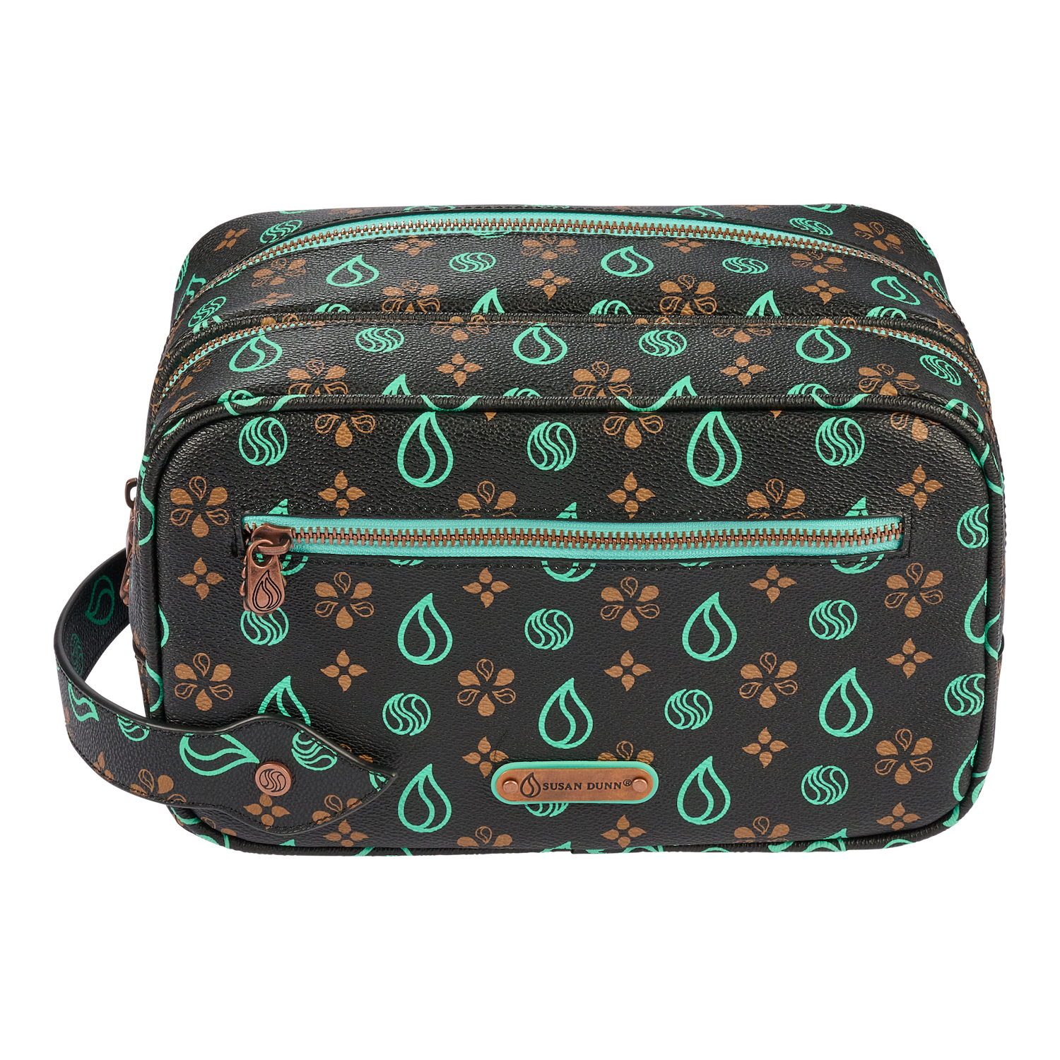 His or Hers, our Grand Toiletries Case may certainly be the most essential travel case you will ever discover. With Dual Top zippers, two generous compartments help separate your grooming, hair, make-up, and skin care items. The front exterior zipper area is perfect for quick access items. The front section boasts an interior zip pocket, and the handy back section elastic pocket serves as a useful catch all. A separate vinyl zip case is ideal for your supplements or smaller grooming items. Fashioned from iconic signature monogram canvas material with interior nylon linings sporting our glorious Waterfall design, crystal-clear vinyl linings enhance the compartment bottoms. Five special feet support and raise your vanity case off the counter to insure it remains dry from the elements. A side handle facilitates ease of handling and maneuvering. A special custom-made pillow fits inside the case snugly to keep its form when not in use. The icing is our lovely Waterfall zip cover that preserves and protects in storage and travel. We will exceed your expectations with this marvelously useful and stylish accessory necessity.