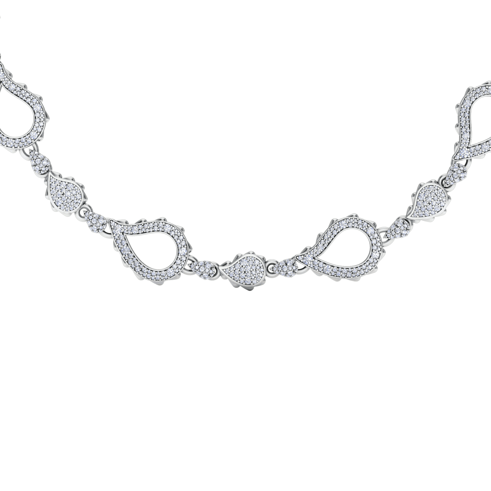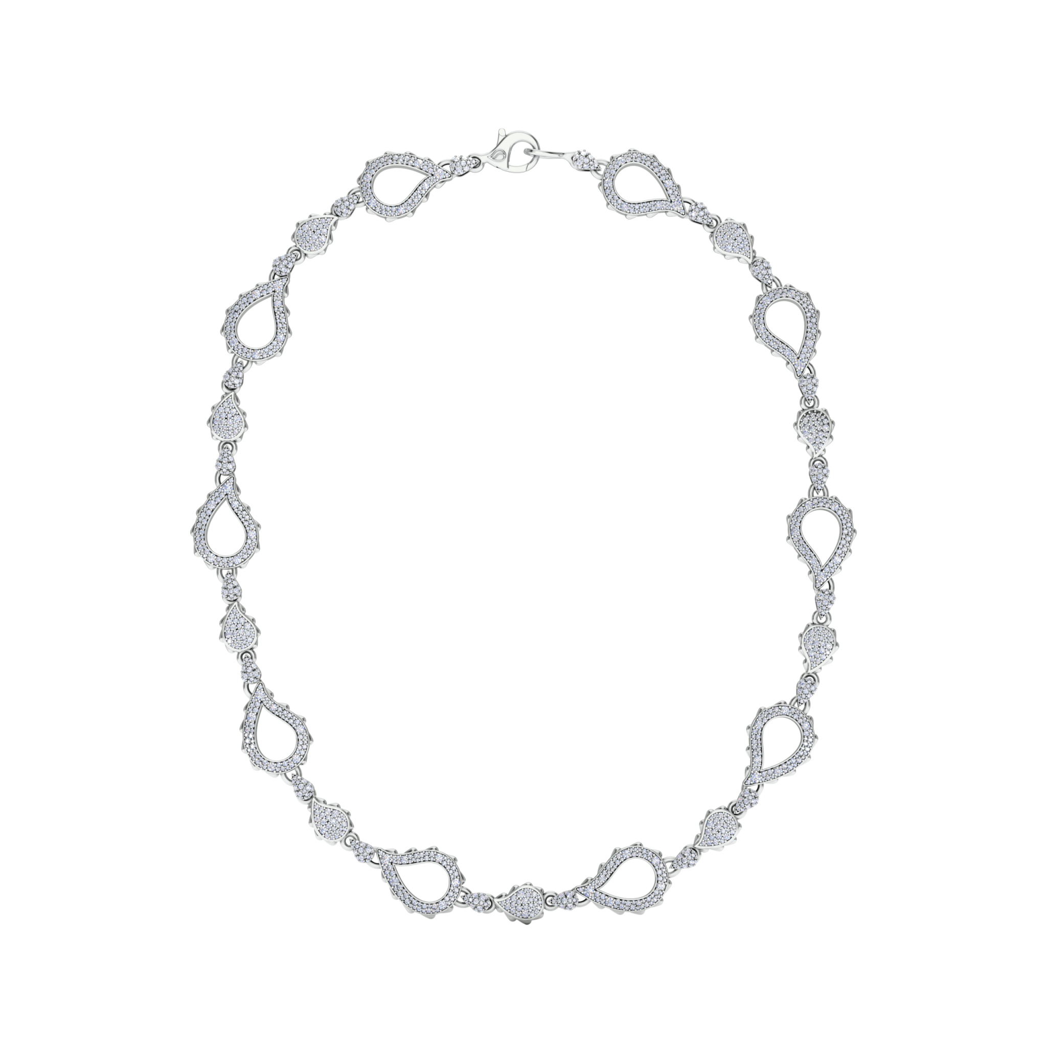 The High Pave Grand Duo Necklace is available in 18K White ecological gold with Fairmined Certification. Encrusted with diamonds of the finest DEF, VVS quality, responsibly mined and impeccably cut. This stunning piece is one-of-a-kind: individually cast, handset multi-sized diamonds, meticulously hand finished and polished to perfection.
