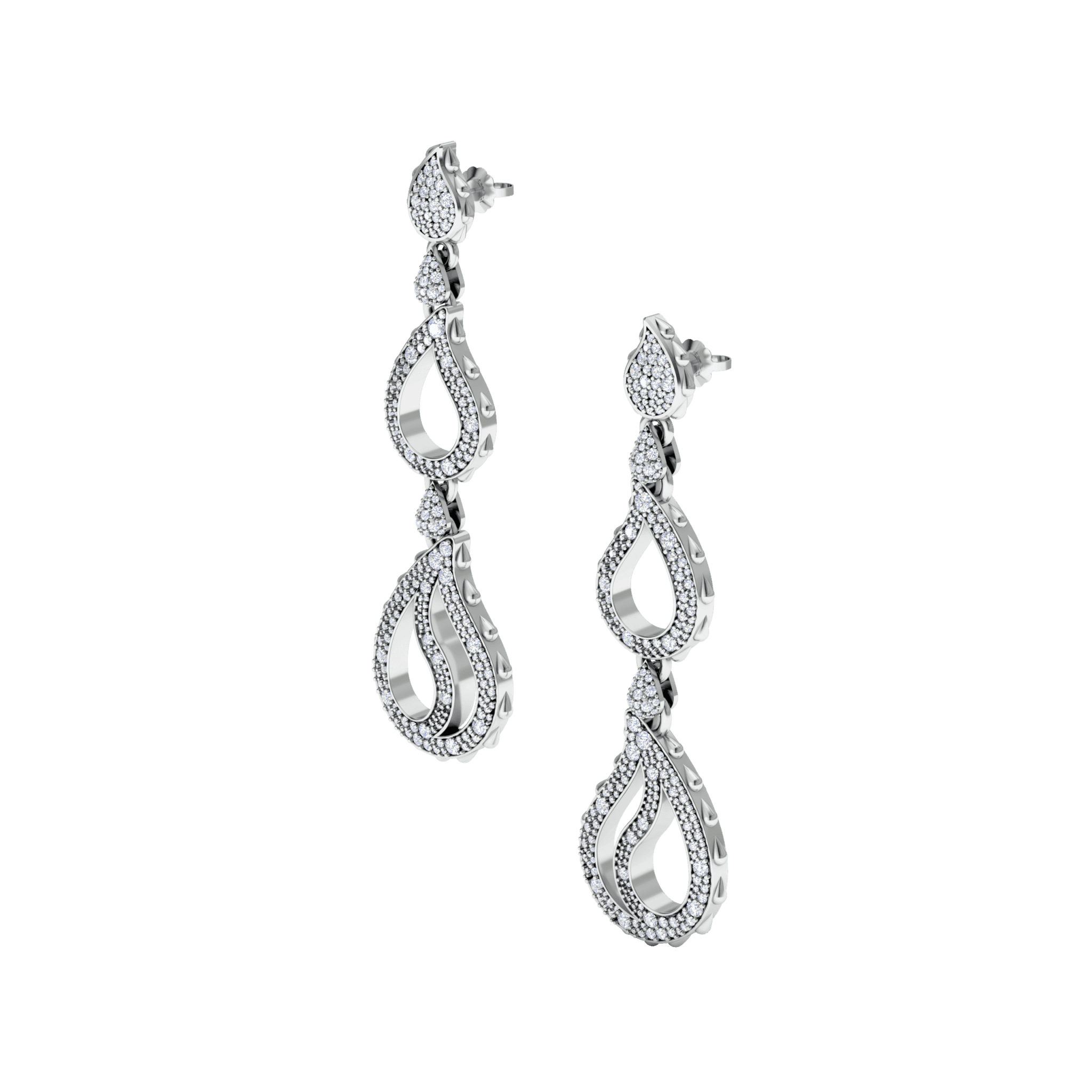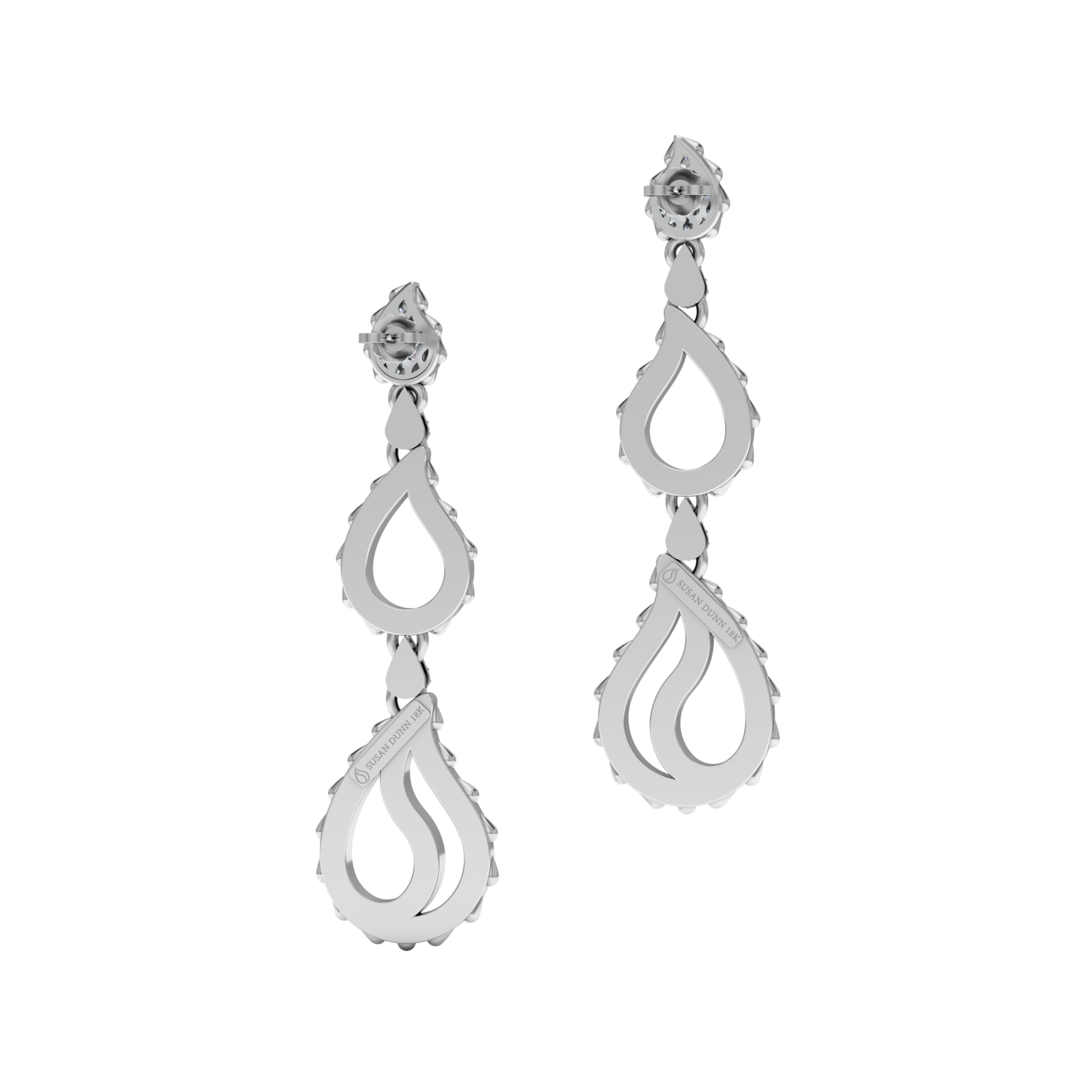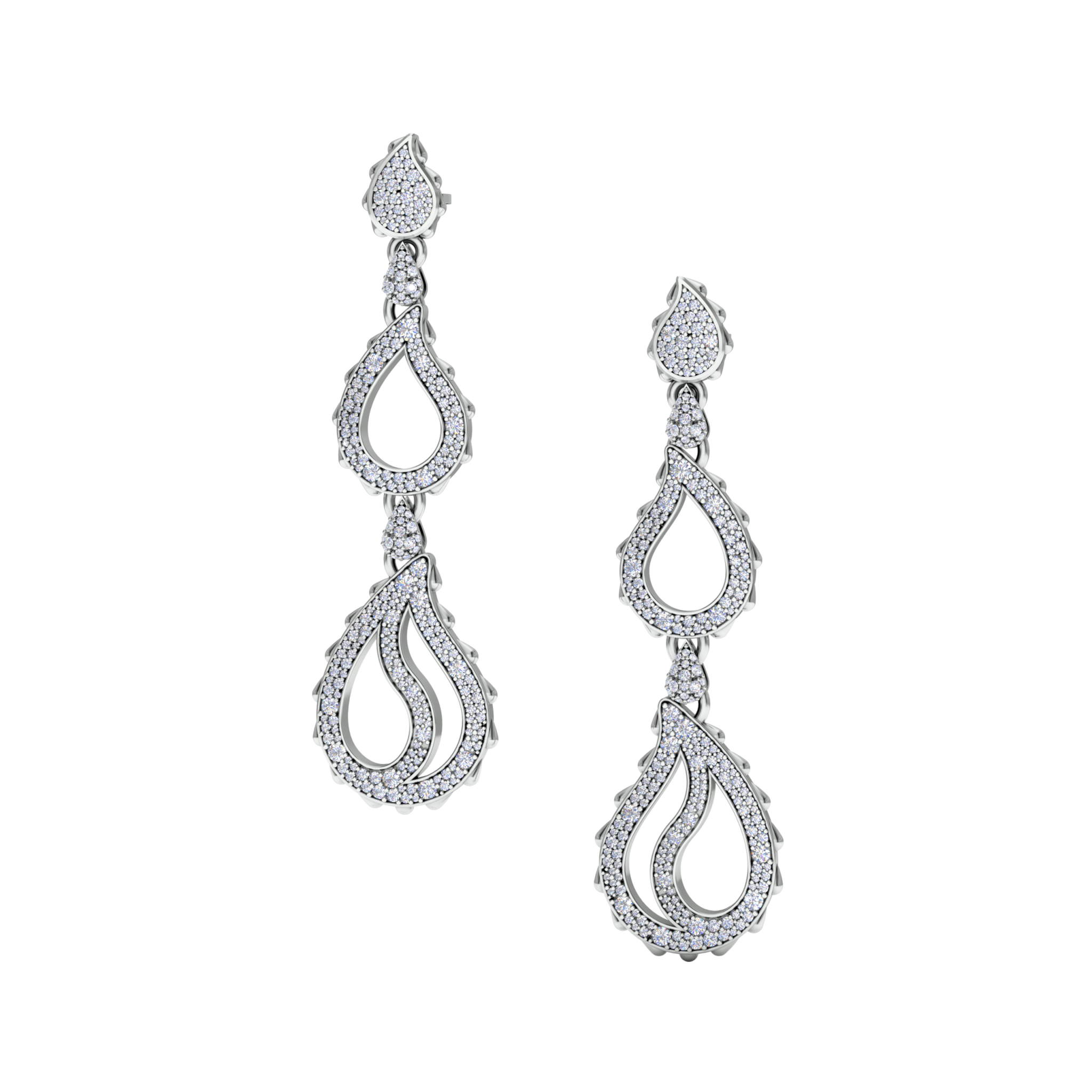 The High Pave Royal Trio Dangles are available in 18K White ecological gold with Fairmined Certification. Encrusted with diamonds of the finest DEF, VVS quality, responsibly mined and impeccably cut. This stunning pair is one-of-a-kind: individually cast, handset multi-sized diamonds, meticulously hand finished and polished to perfection.