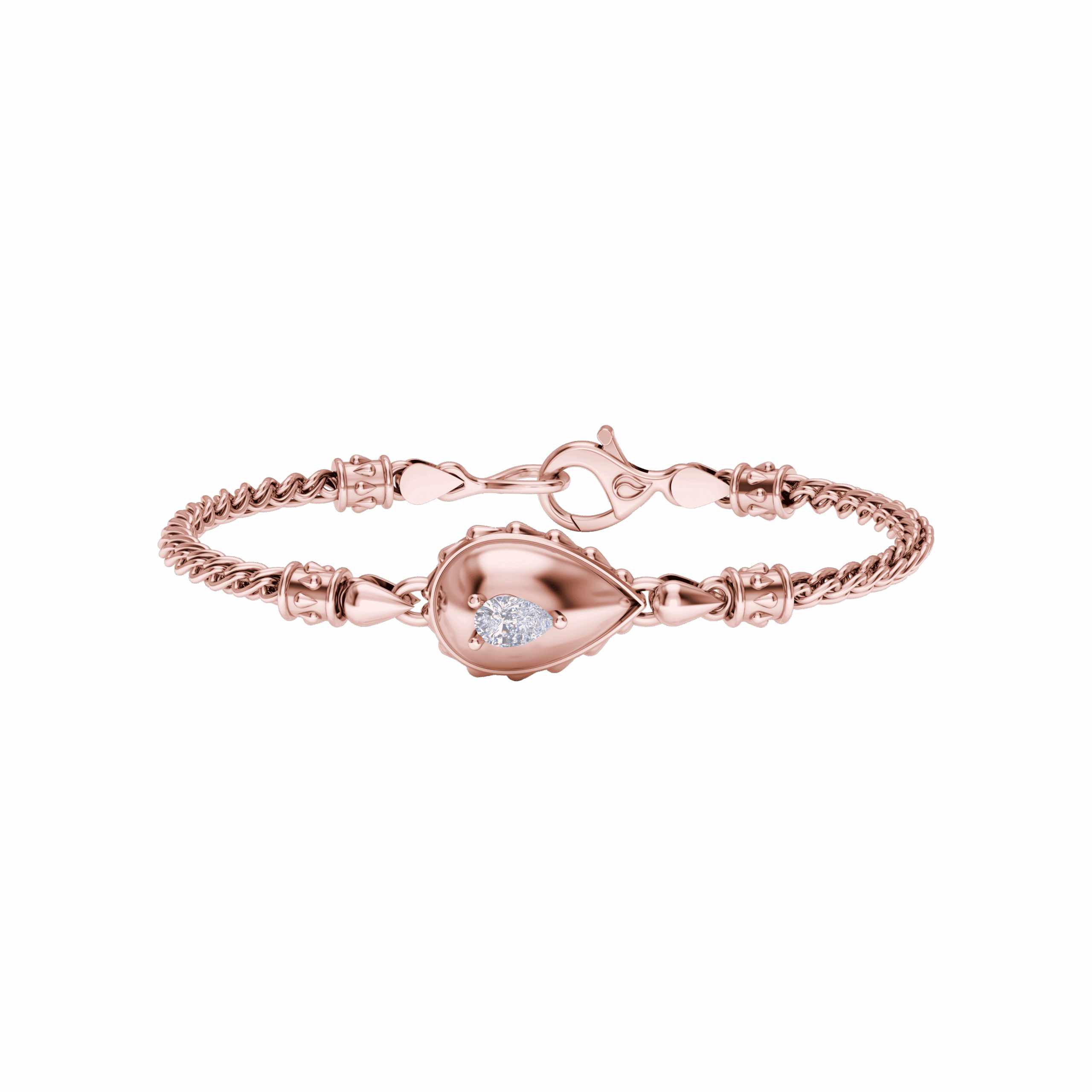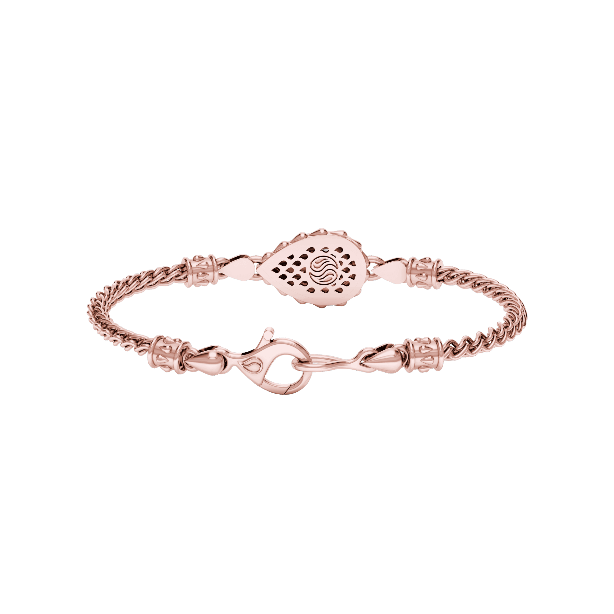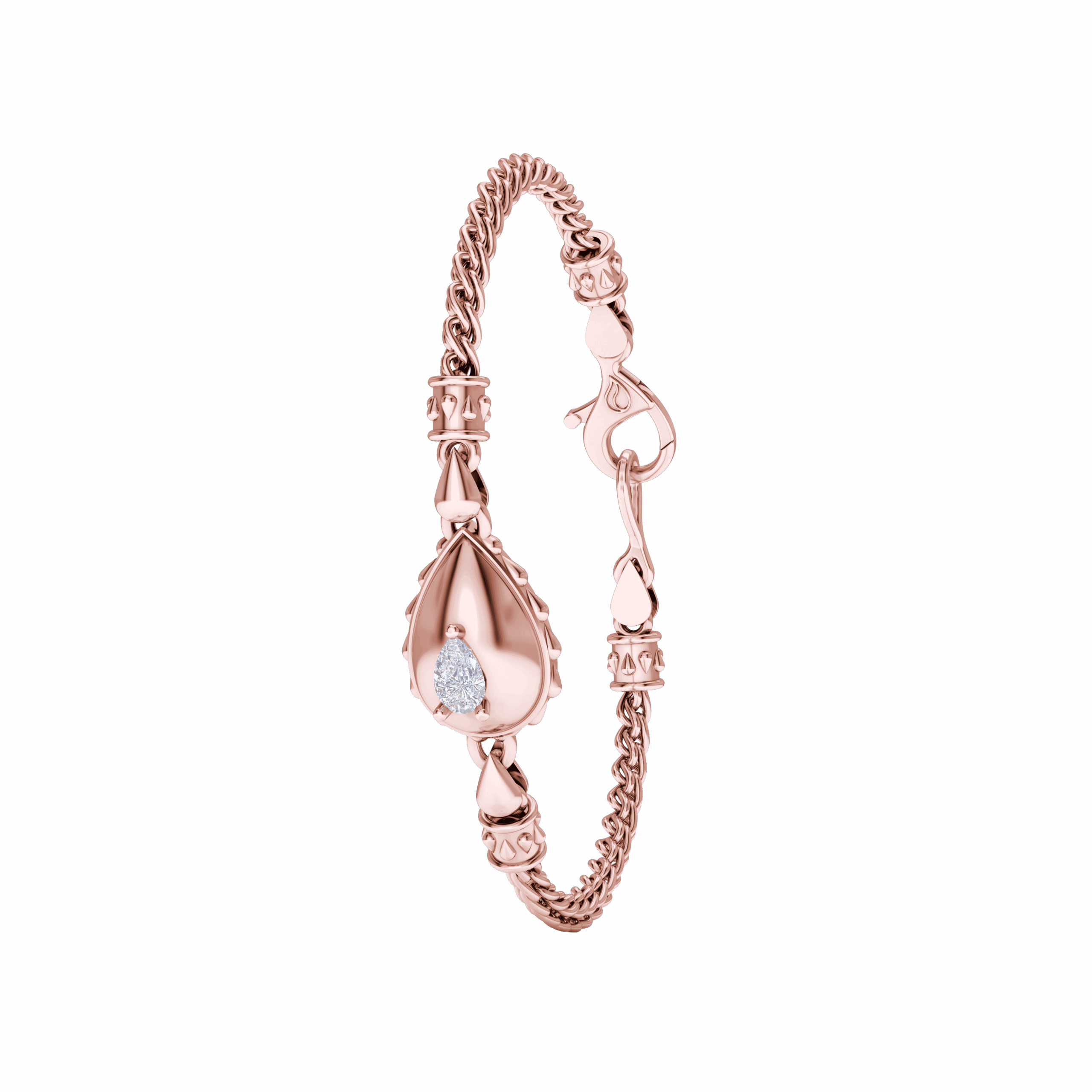 This Rain Grand Chain Bracelet is available in 18K Rose ecological gold with Fairmined Certification.  Adorned with a GIA Certified Water-Drop Shaped diamond of the finest DEF, VVS1 quality, responsibly mined and impeccably cut. Our weighty Signature chain, clasp and decorative detailing sets this stunning piece apart from all others: individually cast, handset diamond, meticulously hand-finished and polished to perfection. Sizes: P/S, M/L