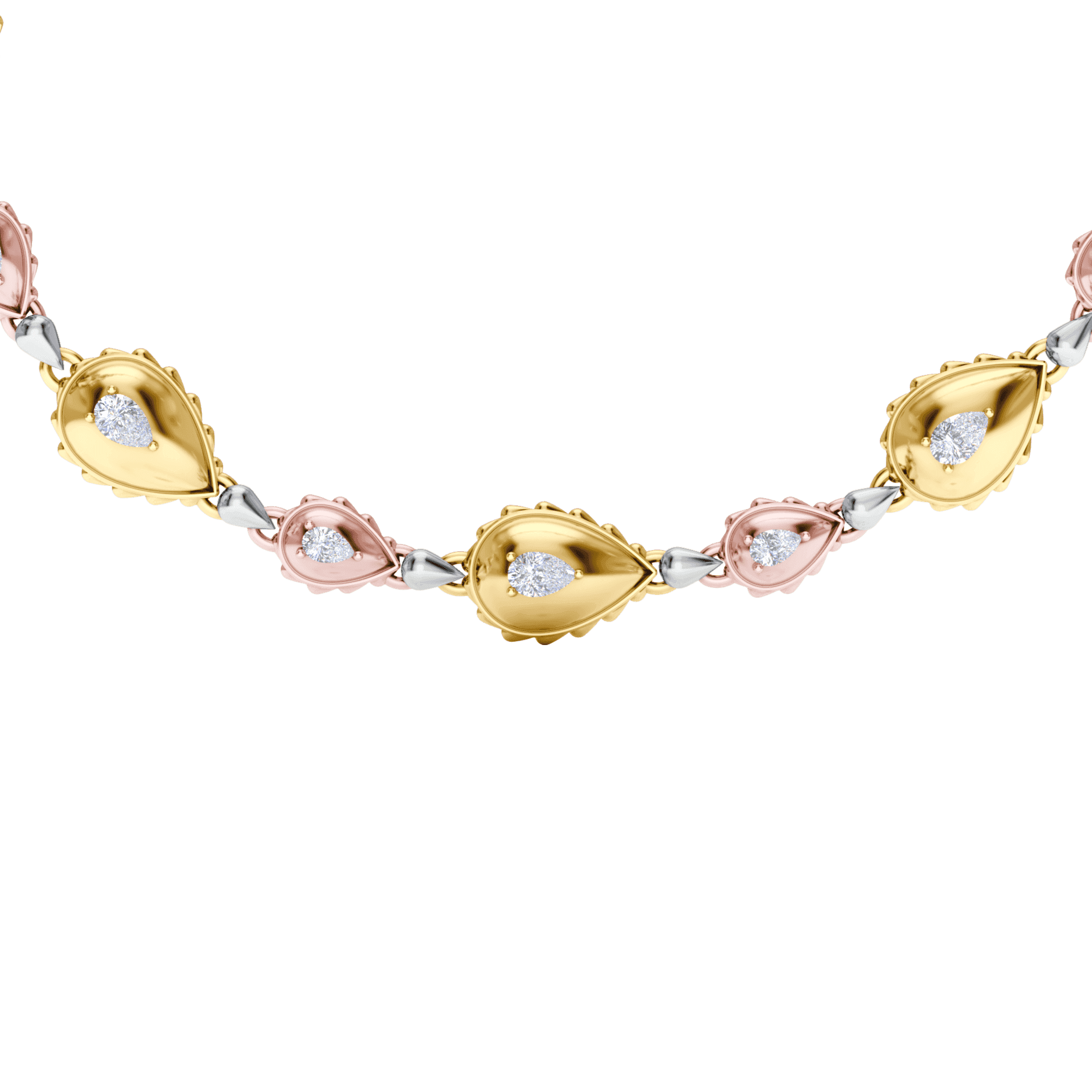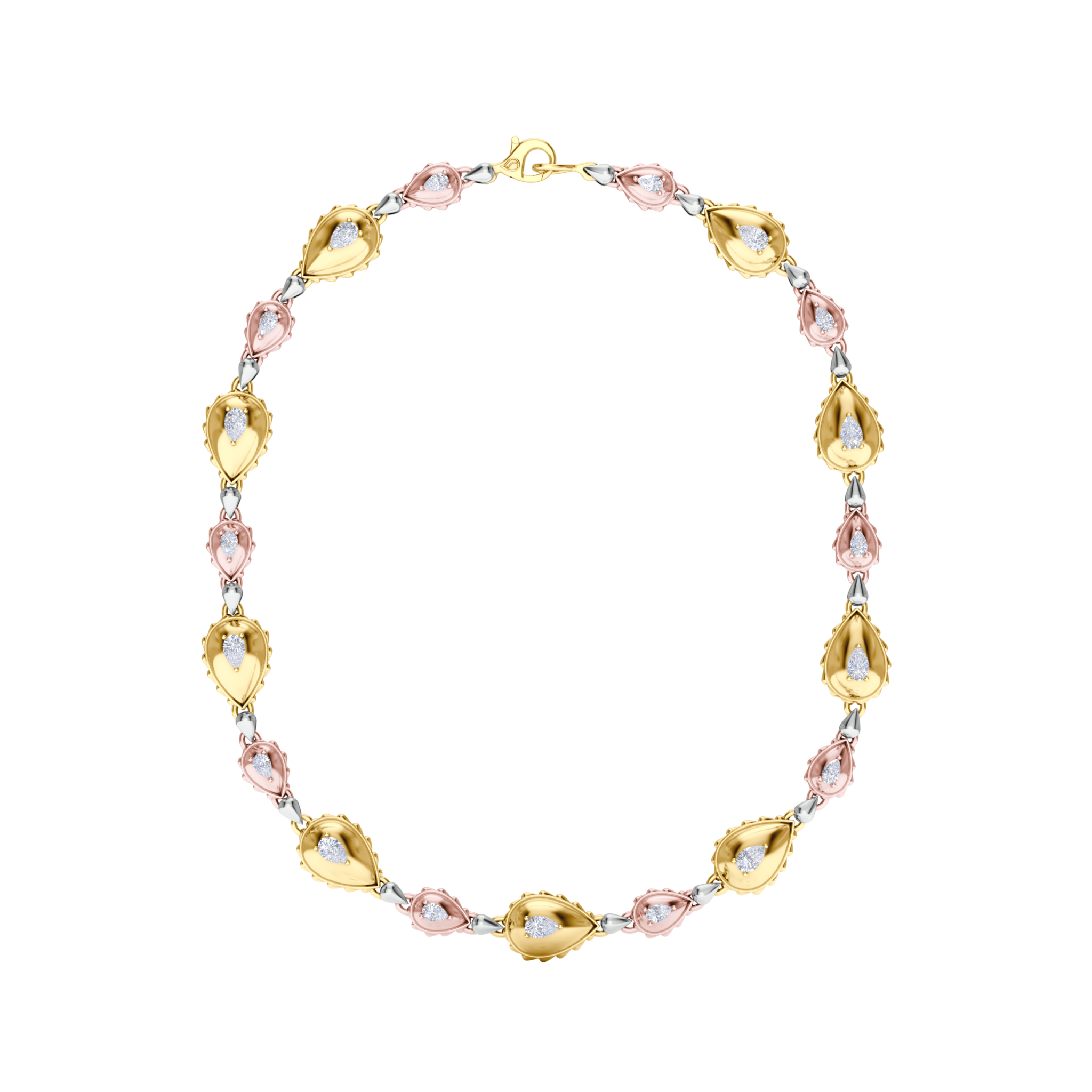 This Rain Grand Duo Necklace is available in 18K Tricolor ecological gold with Fairmined Certification. A remarkable creation, it is adorned with GIA Certified Waterdrop Shaped diamonds of the finest DEF, VVS1 quality, responsibly mined and impeccably cut. This stunning piece is one-of-a-kind: individually cast, handset diamonds, meticulously hand finished and polished to perfection.