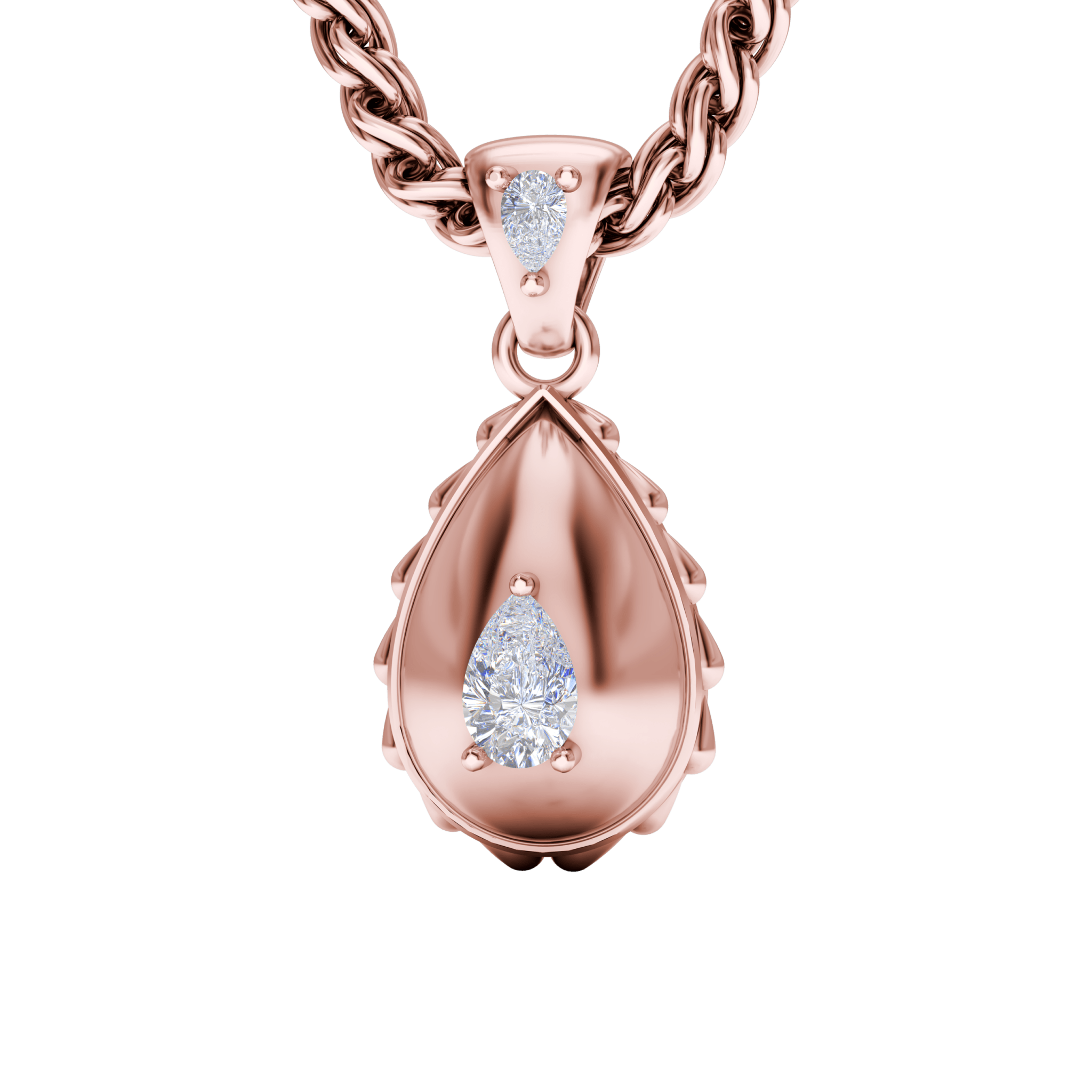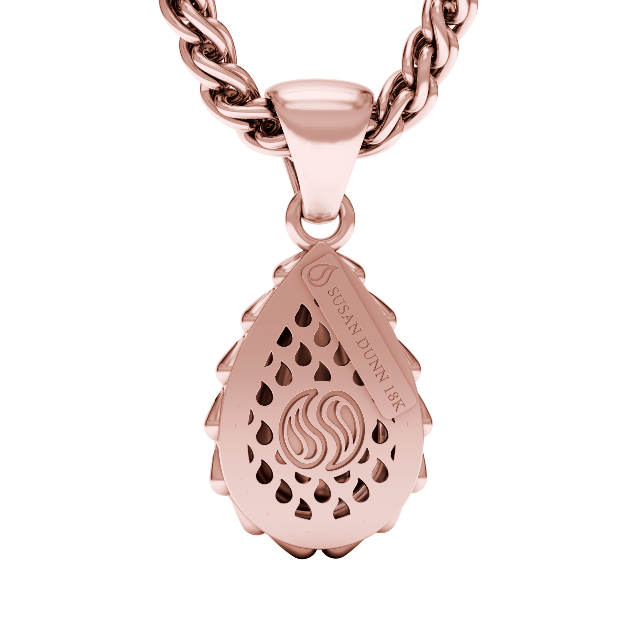 The Rain Grand Pendant is available in 18K Rose ecological gold with Fairmined Certification. Adorned with GIA Certified Waterdrop Shaped diamonds of the finest DEF, VVS1 quality, responsibly mined and impeccably cut. This stunning piece is one-of-a-kind: individually cast, handset diamonds, meticulously hand finished and polished to perfection.