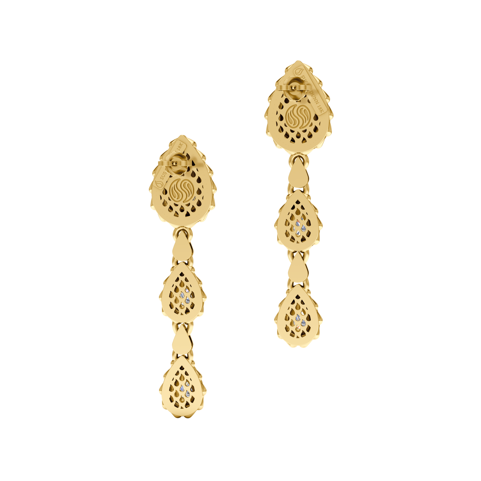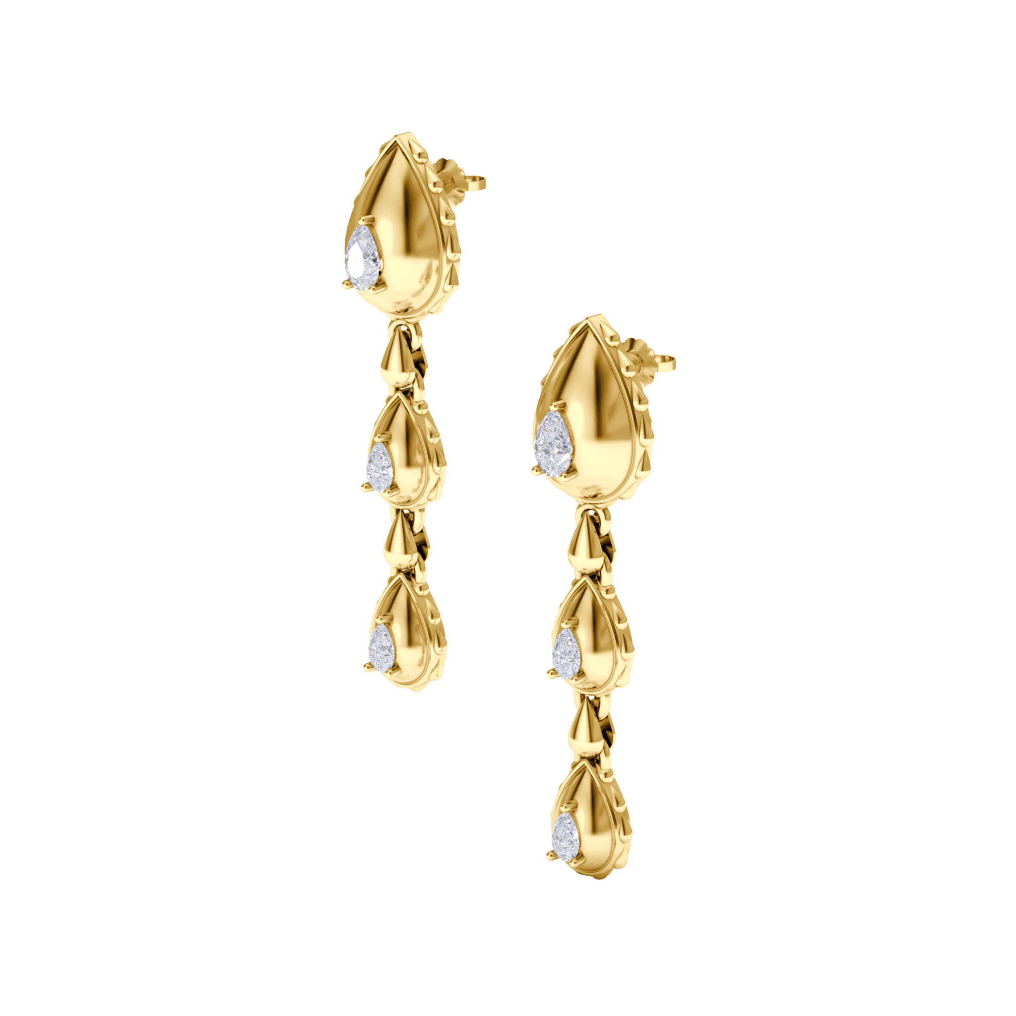 The Rain Grand Trio Dangles are available in 18K Yellow ecological gold with Fairmined Certification. Adorned with GIA Certified Waterdrop Shaped diamonds of the finest DEF, VVS1 quality, responsibly mined and impeccably cut. This stunning pair is one-of-a-kind: individually cast, handset diamonds, meticulously hand finished and polished to perfection.