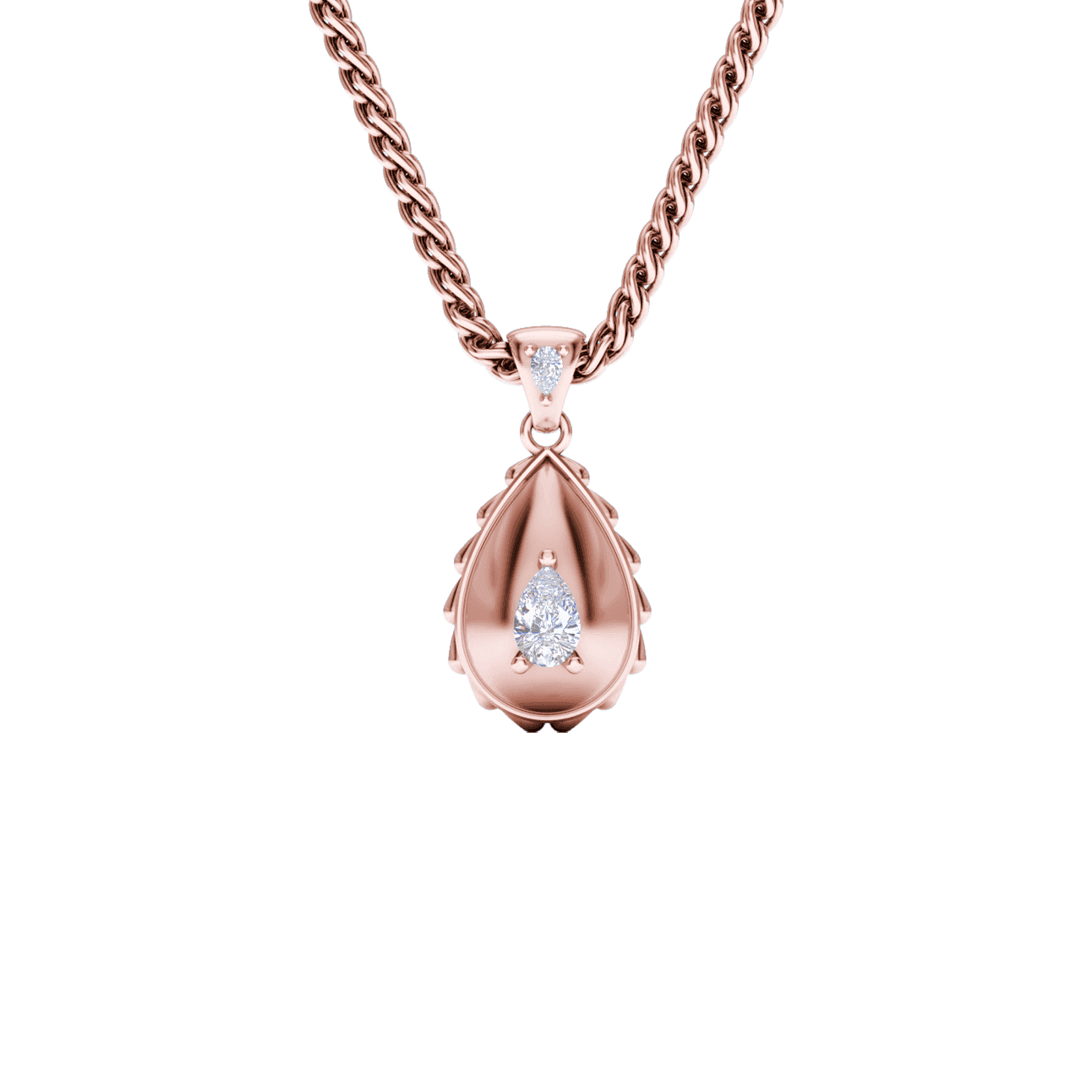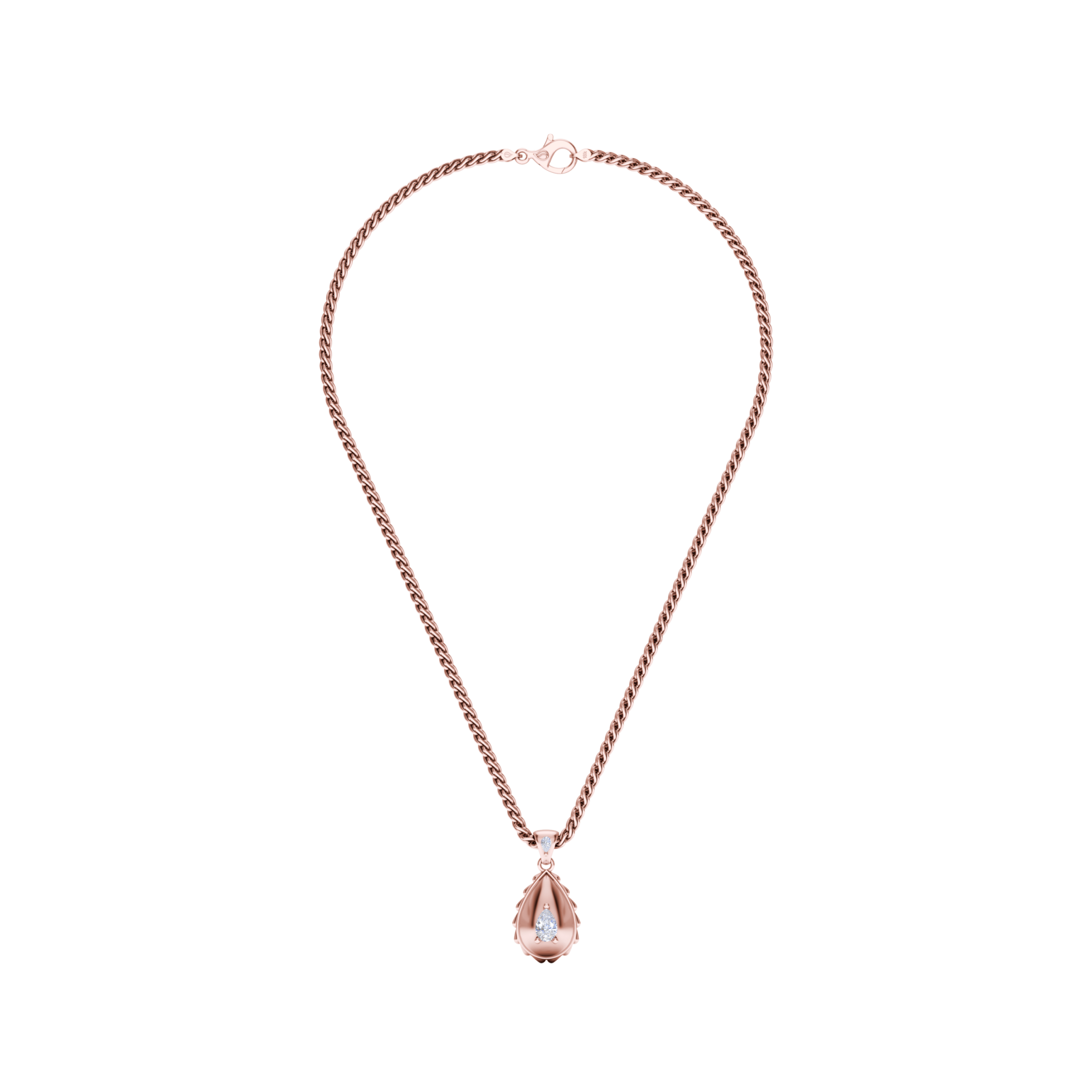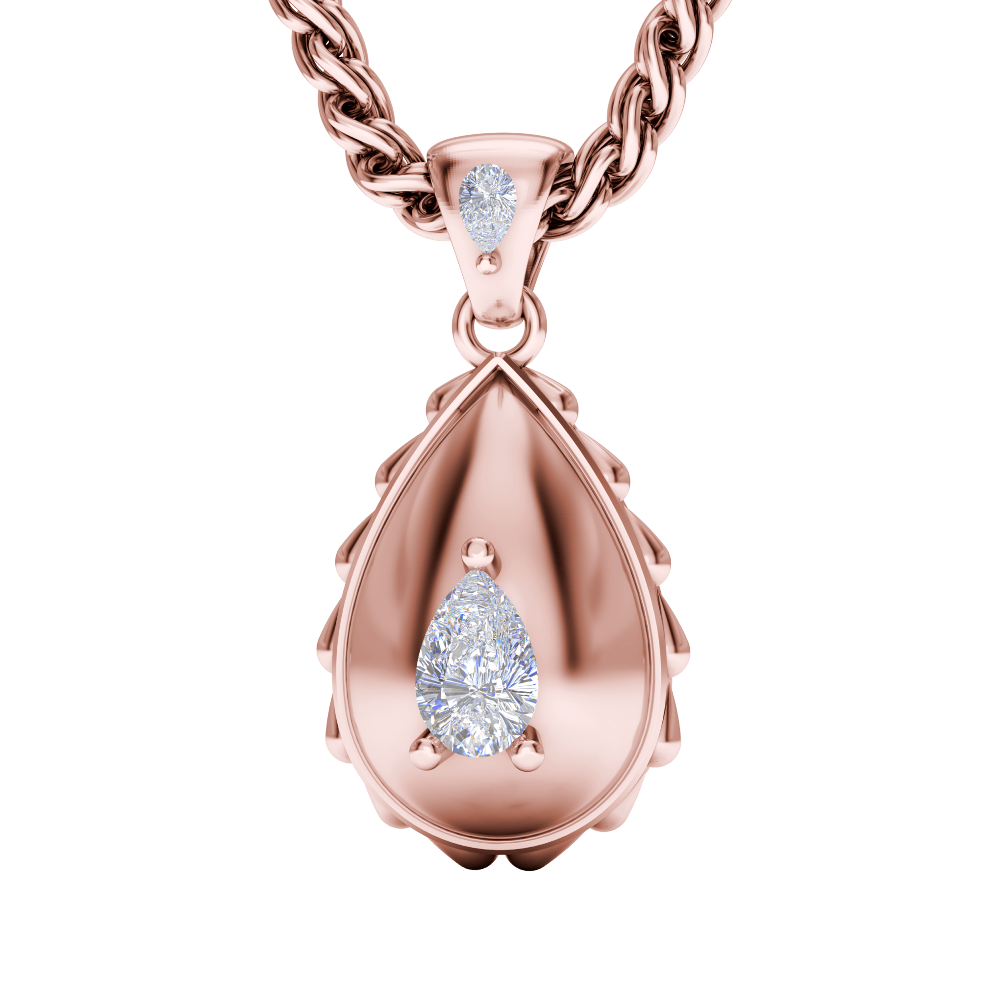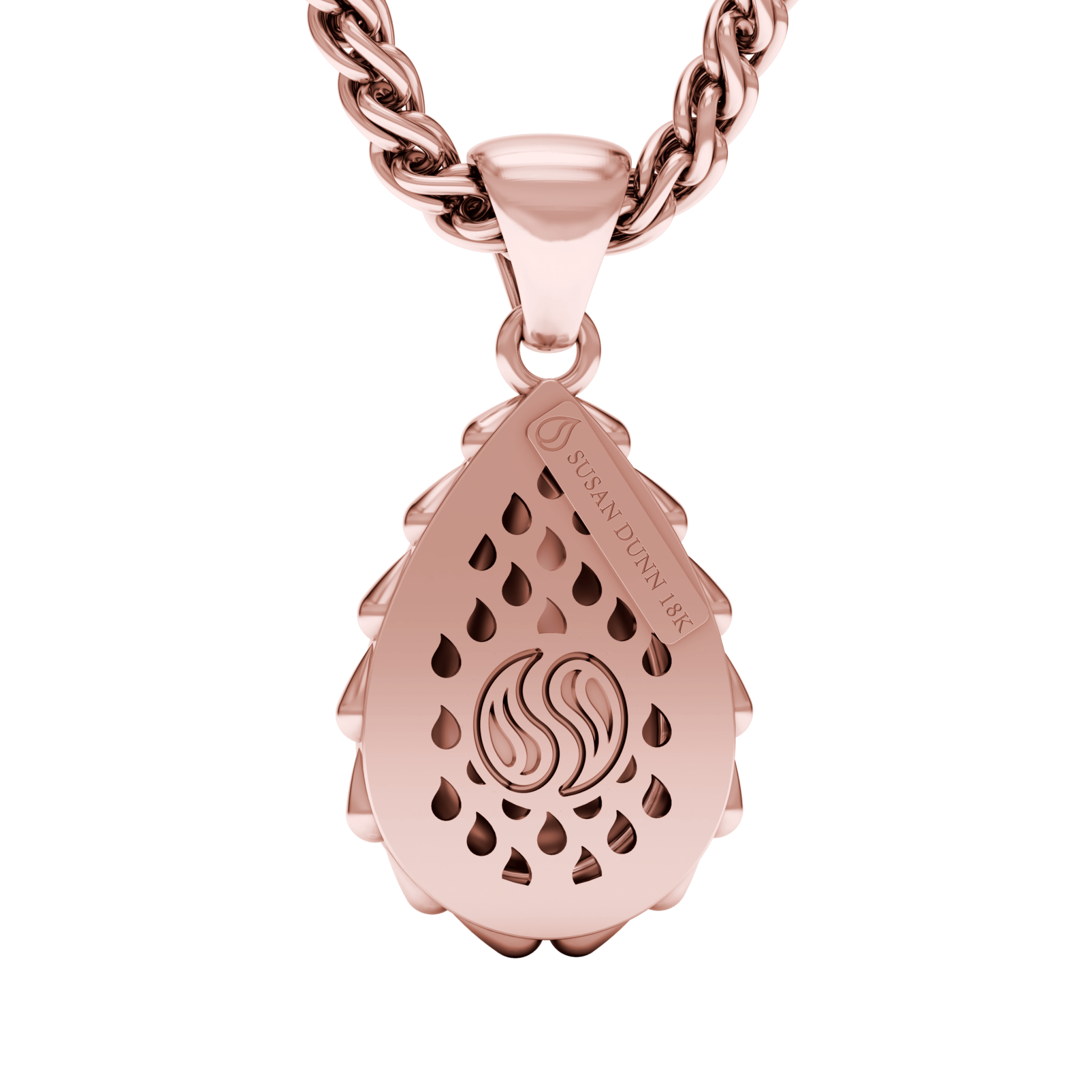 The Rain Royal Pendant is available in 18K Rose ecological gold with Fairmined Certification. Adorned with Waterdrop Shaped diamonds of the finest DEF, VVS1 quality, responsibly mined and impeccably cut. This stunning piece is one-of-a-kind: individually cast, handset diamonds, meticulously hand finished and polished to perfection.