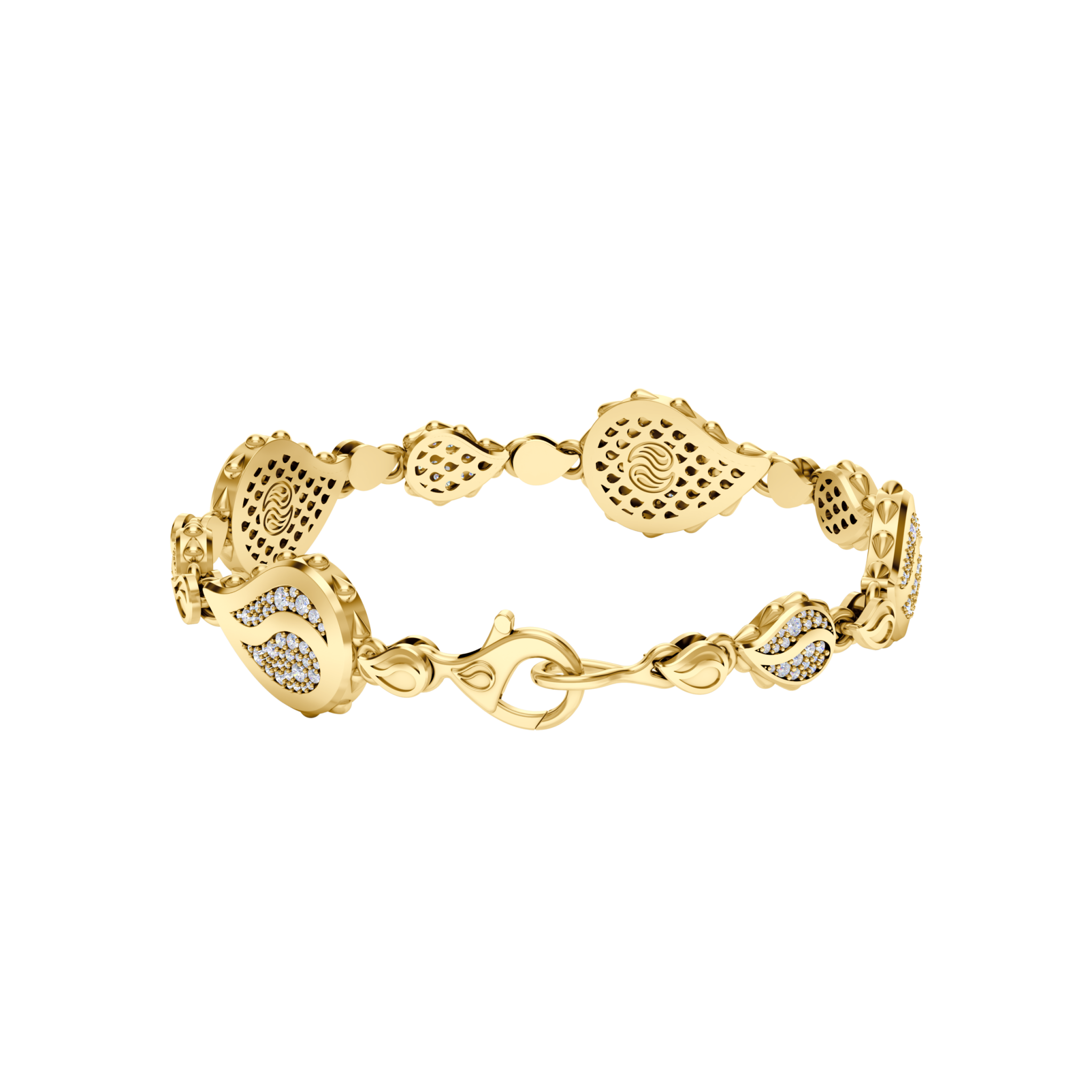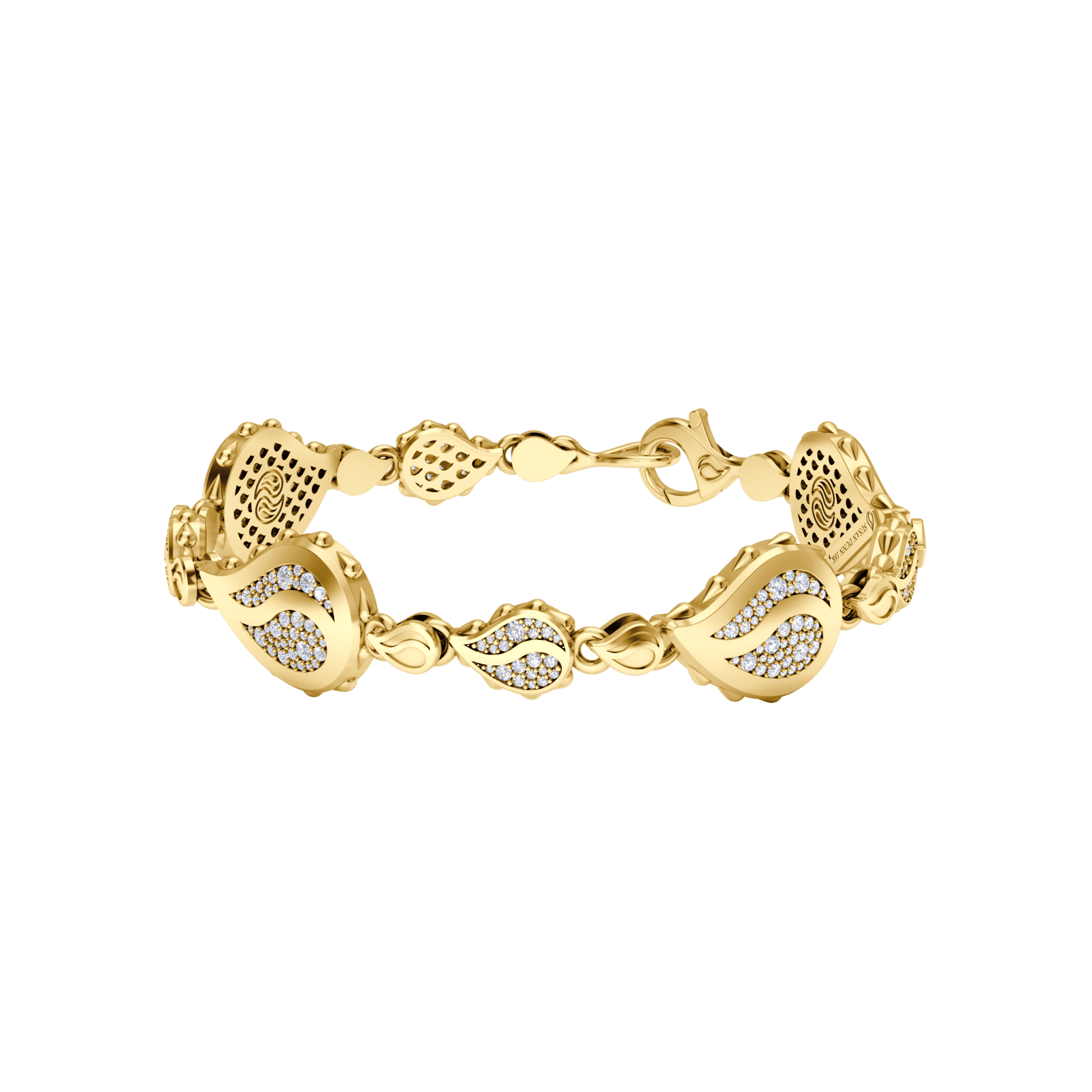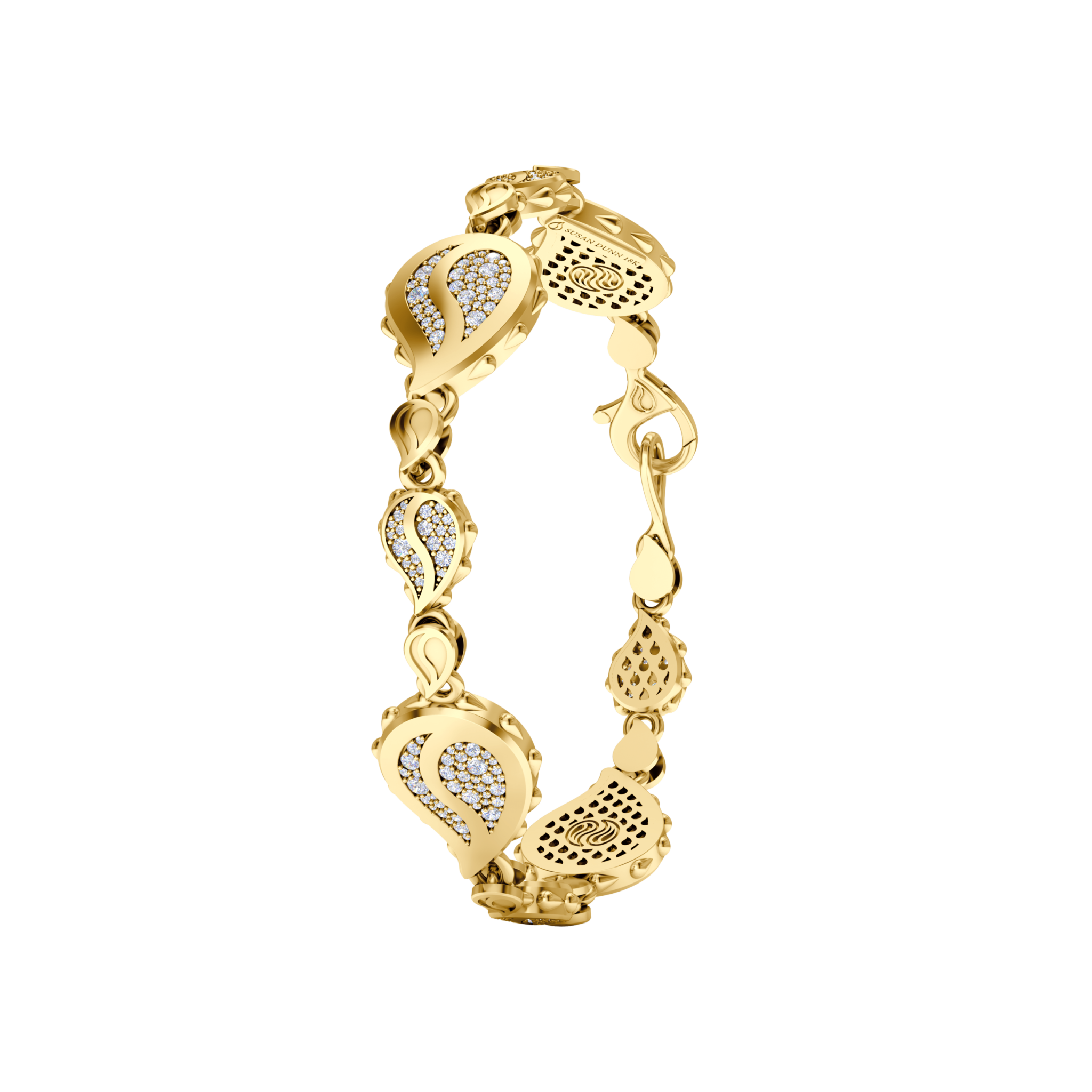 The Signature Grand Duo Bracelet is available in 18K Yellow ecological gold with Fairmined Certification and encrusted with diamonds of the finest DEF, VVS quality, responsibly mined and impeccably cut. This stunning creation is one-of-a-kind: individually cast, handset diamonds, meticulously hand finished and polished to perfection.