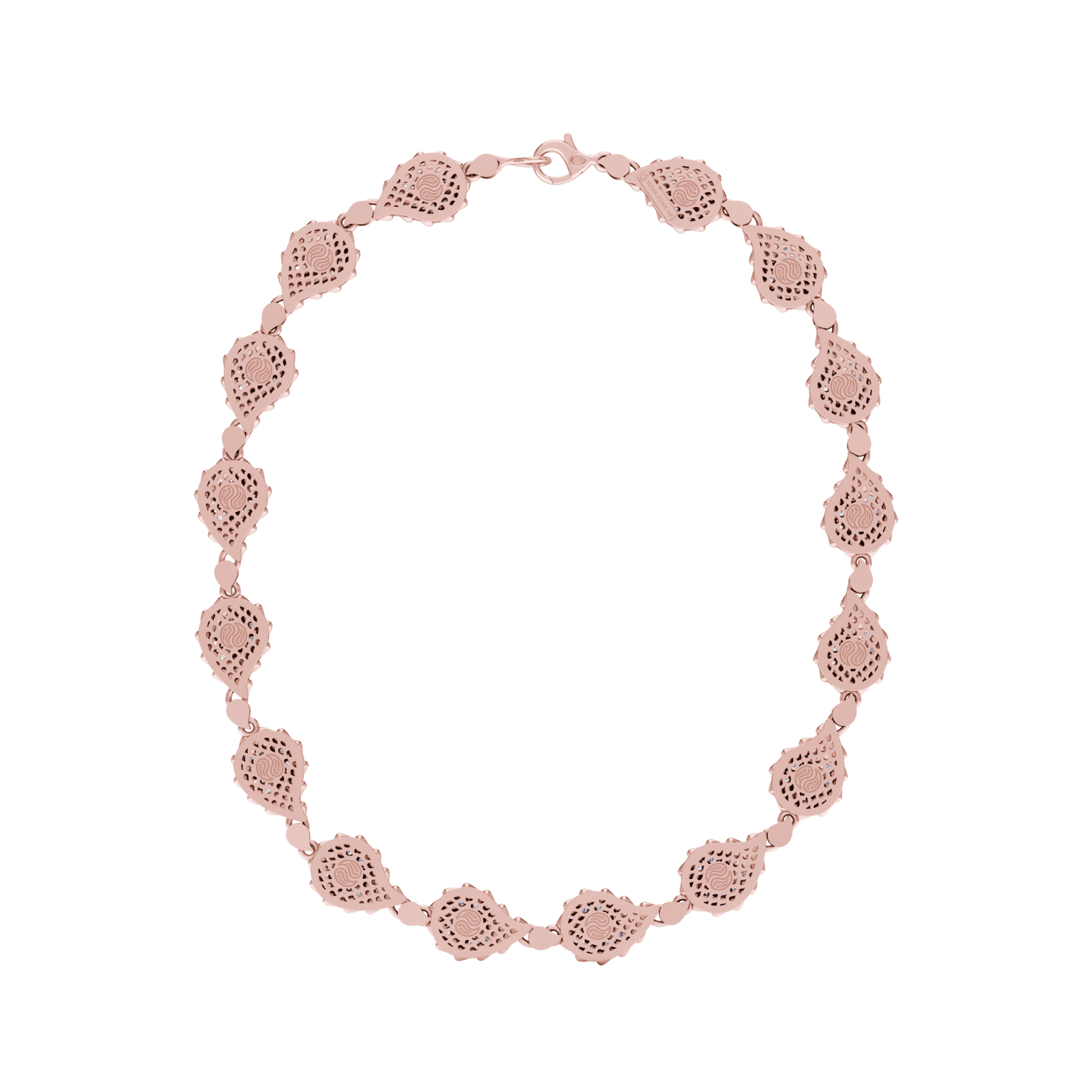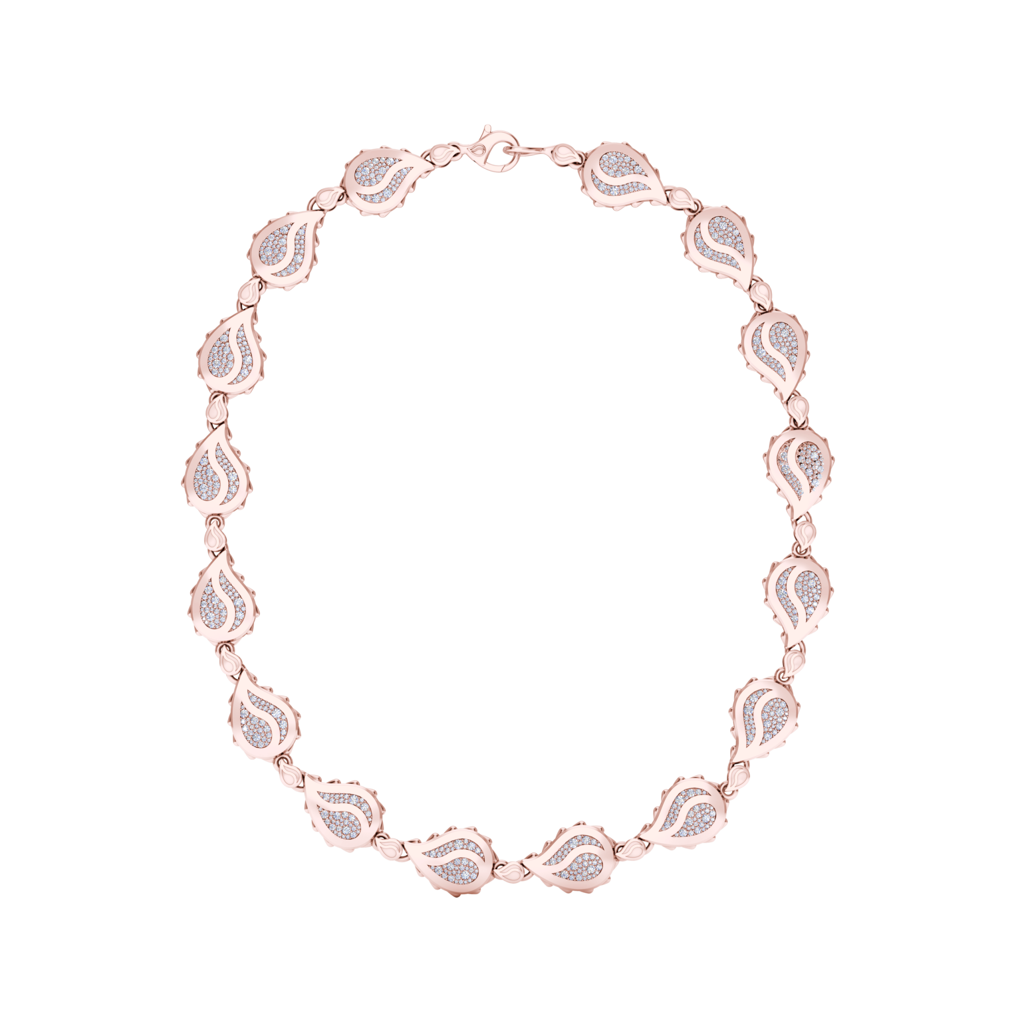The Signature Grand Necklace is available in 18K Rose ecological gold with Fairmined Certification and encrusted with diamonds of the finest DEF, VVS quality, responsibly mined and impeccably cut. One-of-a-kind, this stunning creation is individually cast, handset with multi-sized diamonds, meticulously hand finished and polished to perfection.