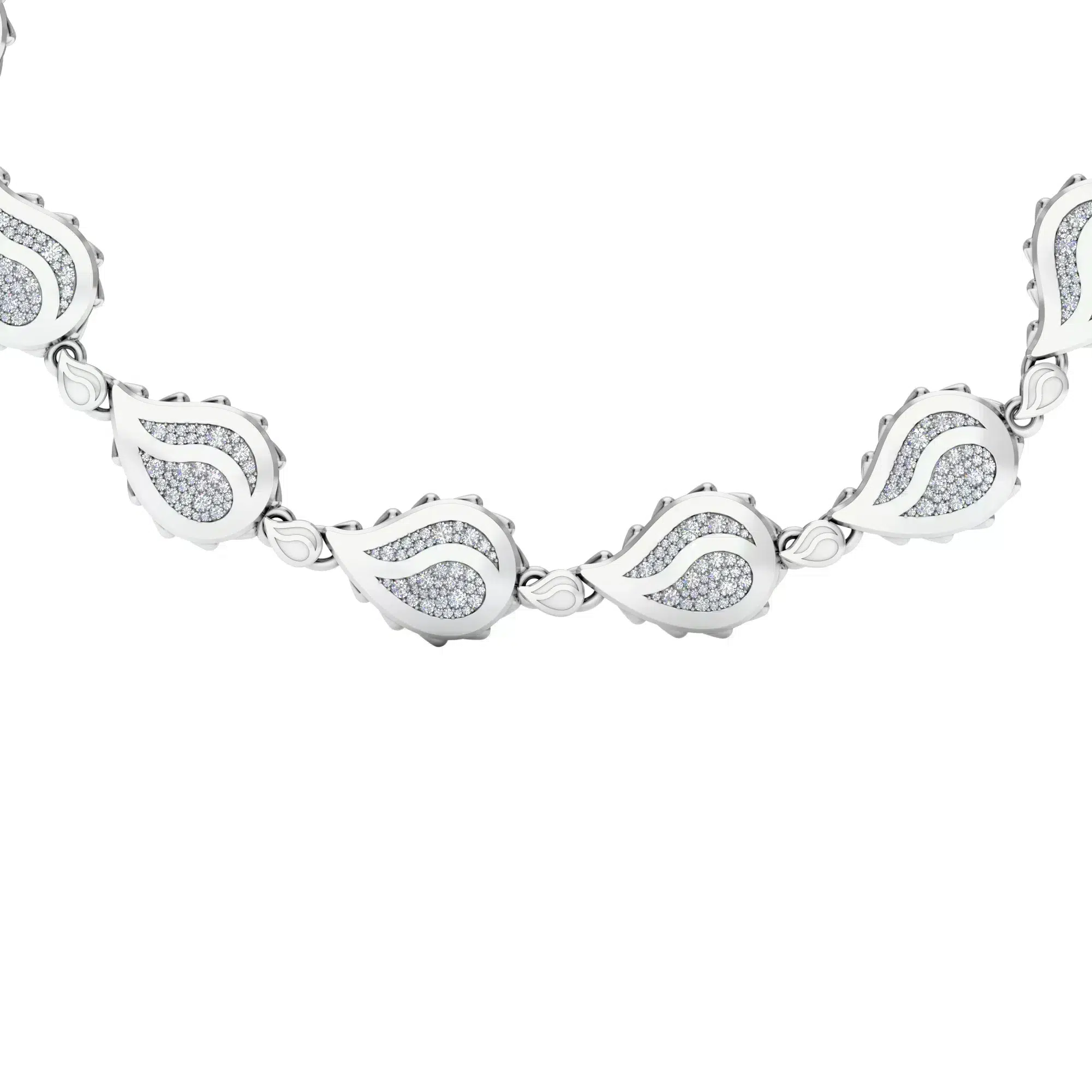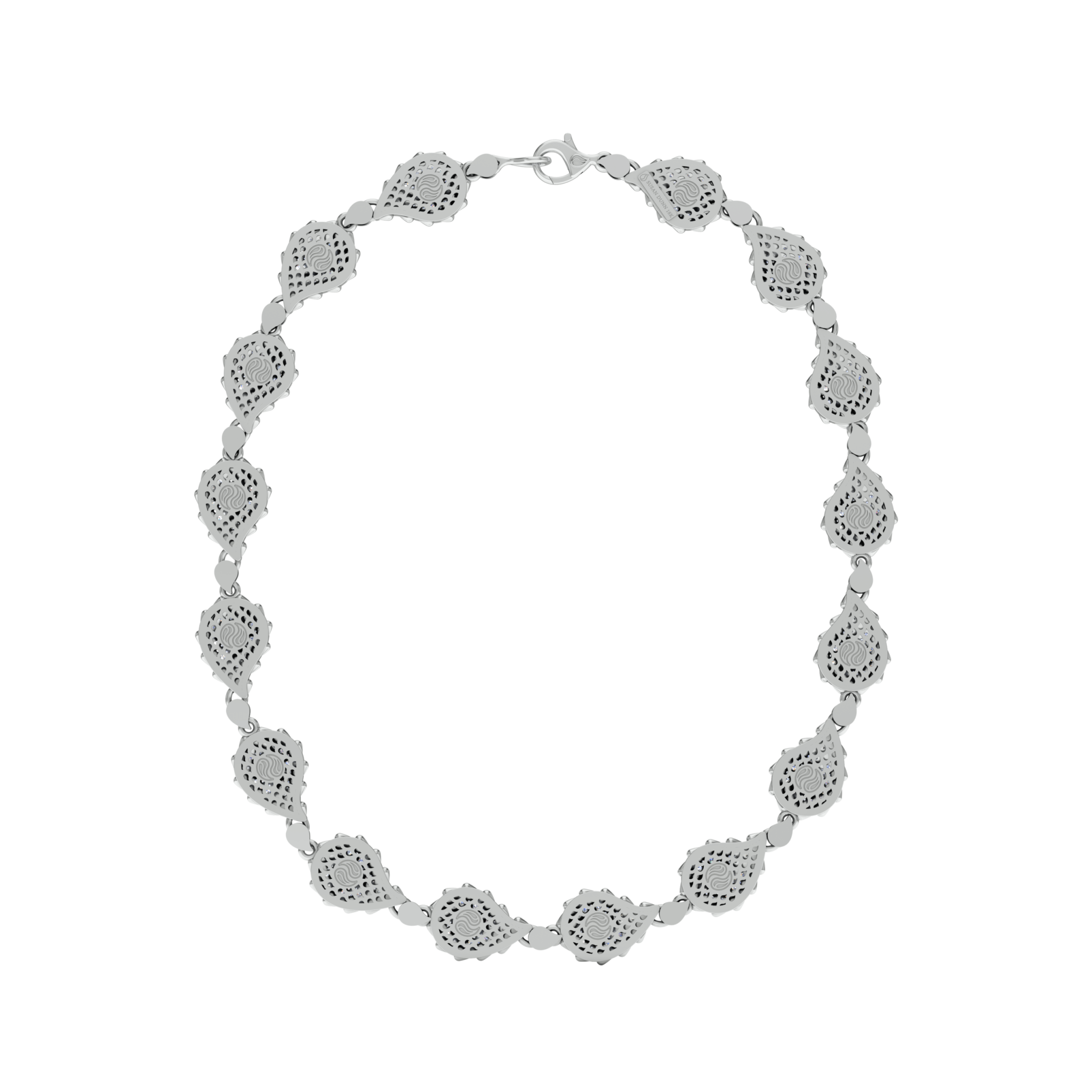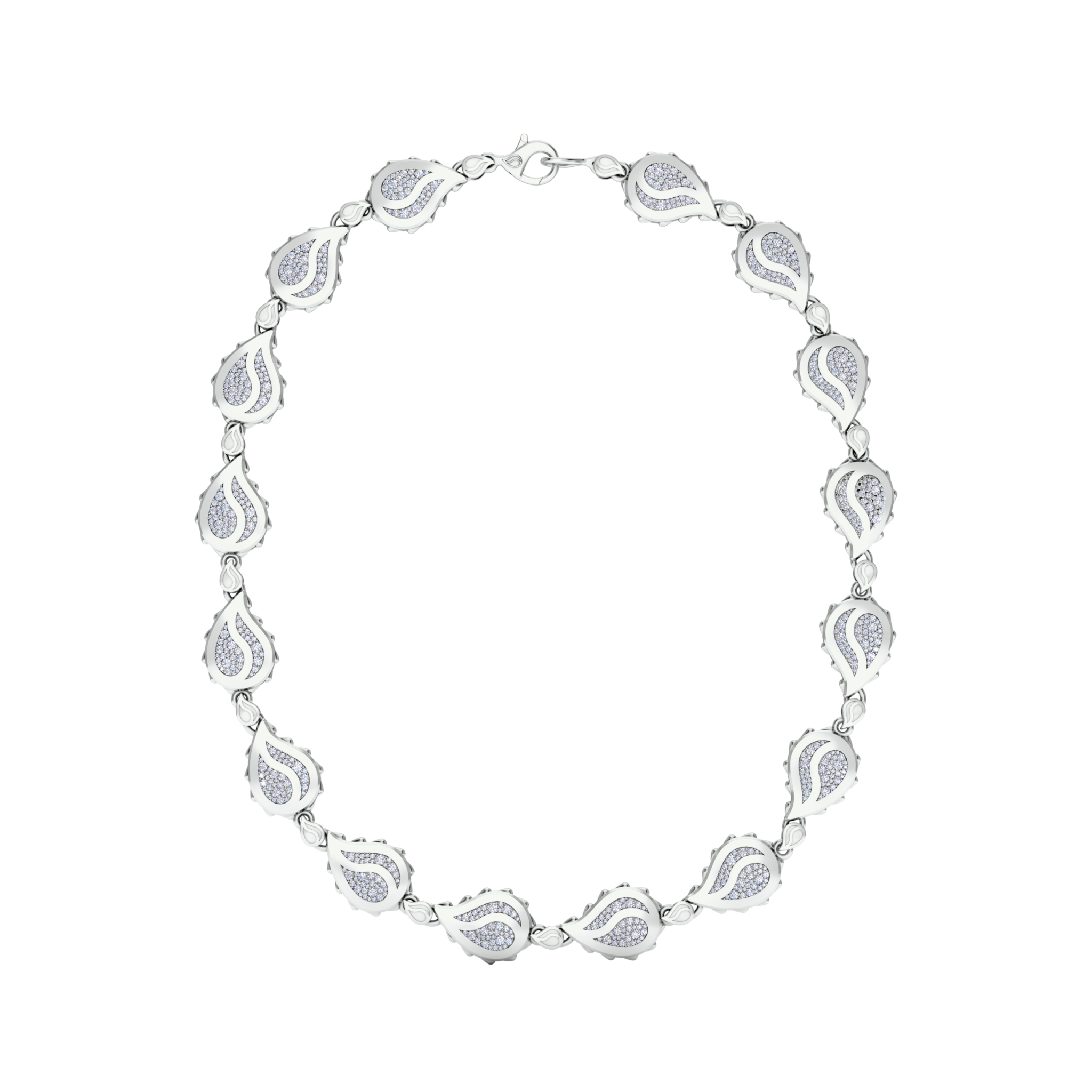 The Signature Grand Necklace is available in 18K White ecological gold with Fairmined Certification and encrusted with diamonds of the finest DEF, VVS quality, responsibly mined and impeccably cut. One-of-a-kind, this stunning creation is individually cast, handset with multi-sized diamonds, meticulously hand finished and polished to perfection.
