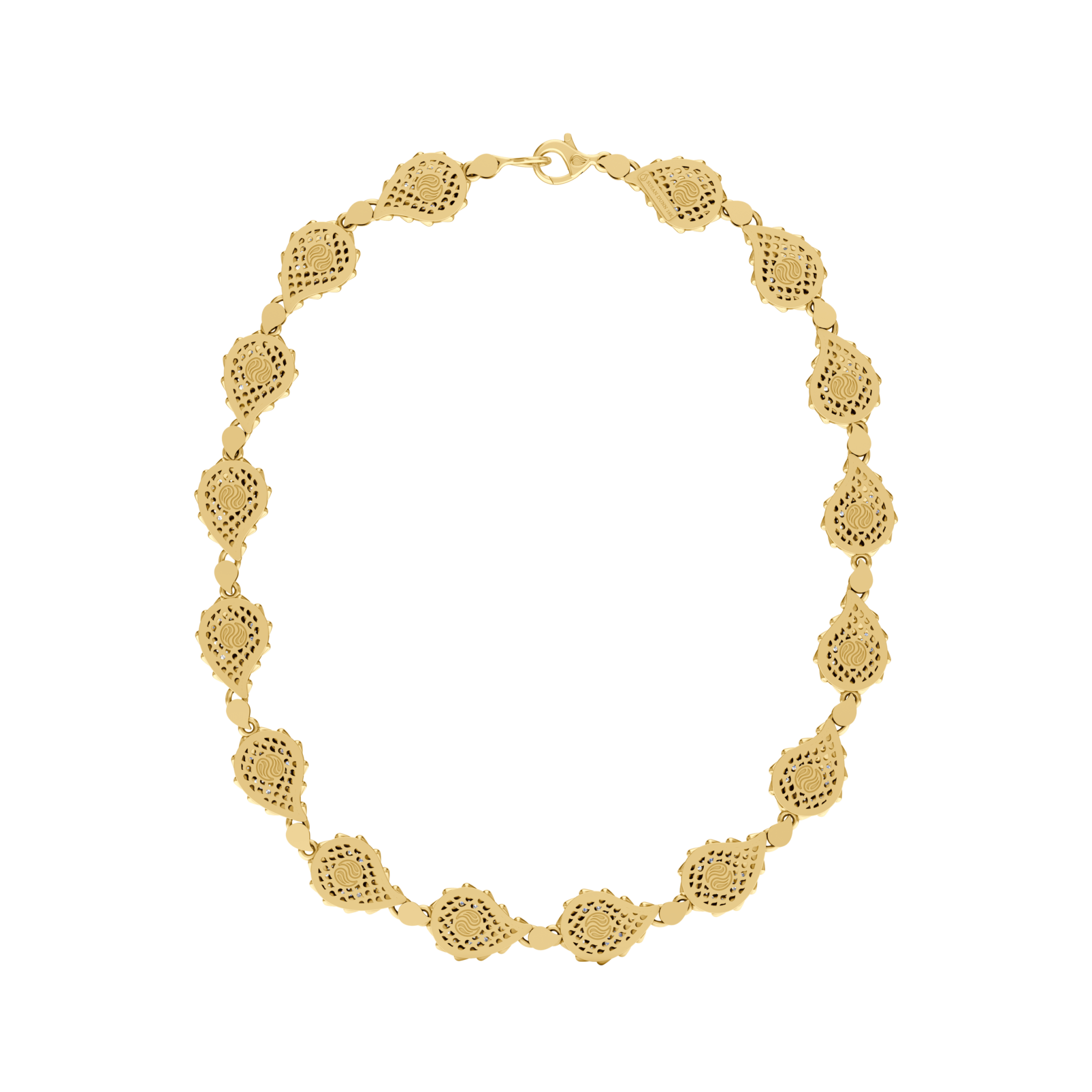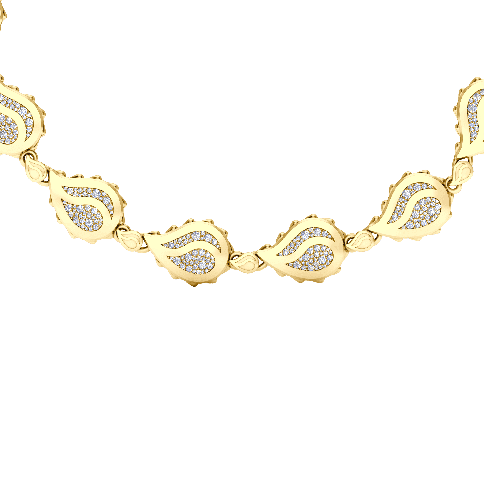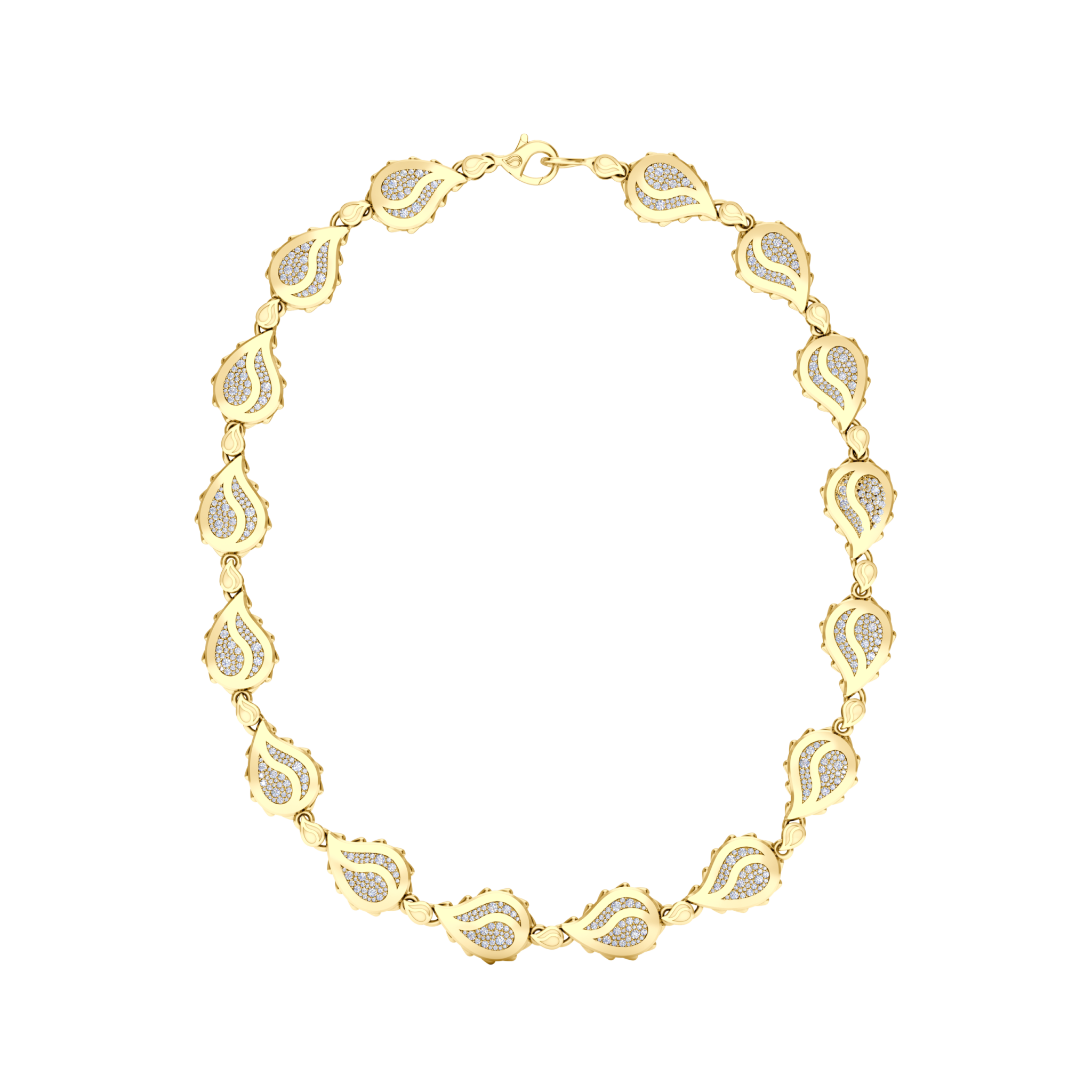 This Signature Grand Necklace is available in 18K Yellow ecological gold with Fairmined Certification. Encrusted with diamonds of the finest DEF, VVS quality, responsibly mined and impeccably cut. This stunning piece is one-of-a-kind: individually cast, handset diamonds, meticulously hand finished and polished to perfection.