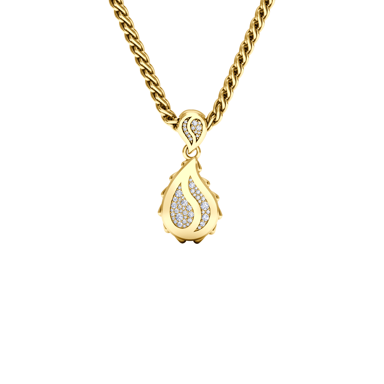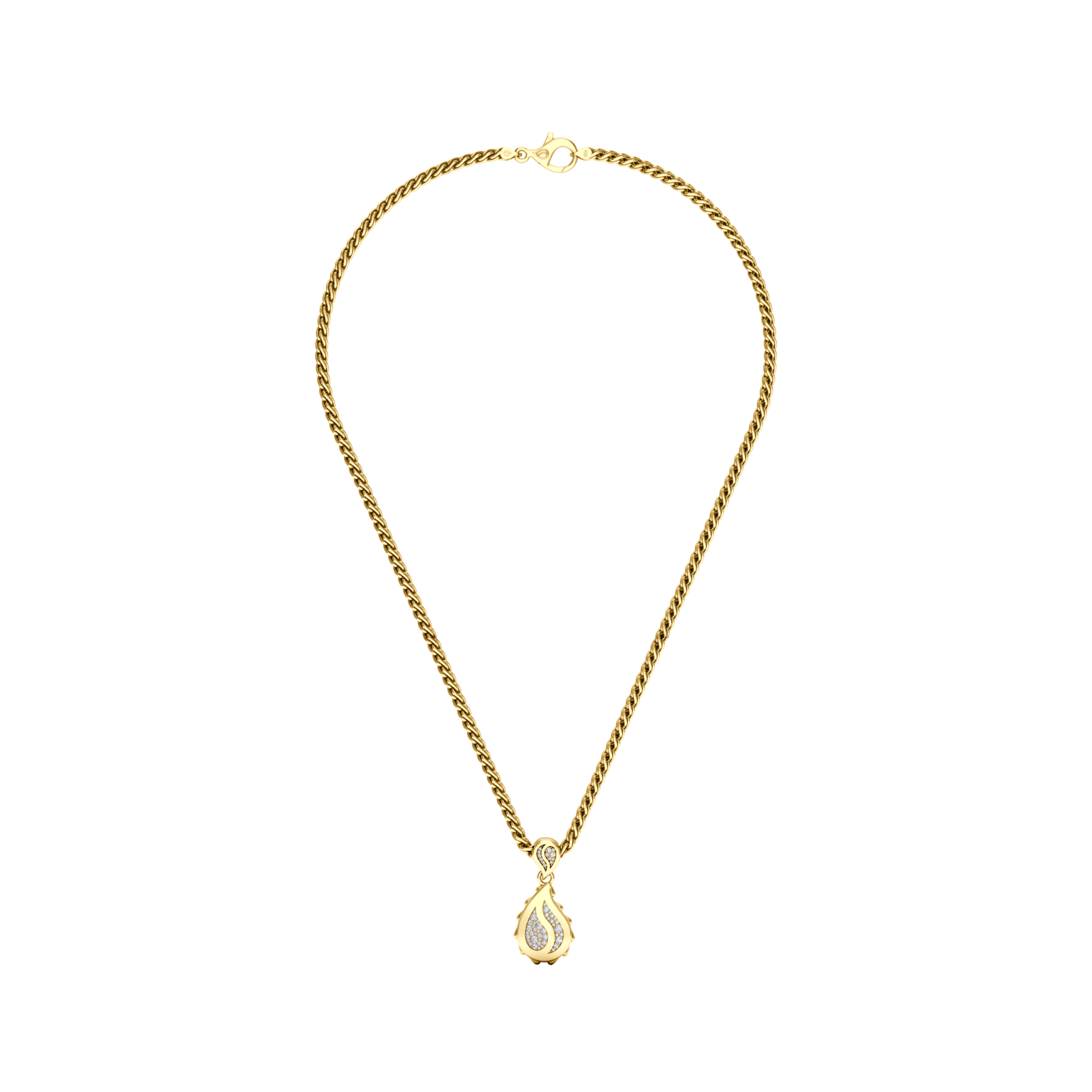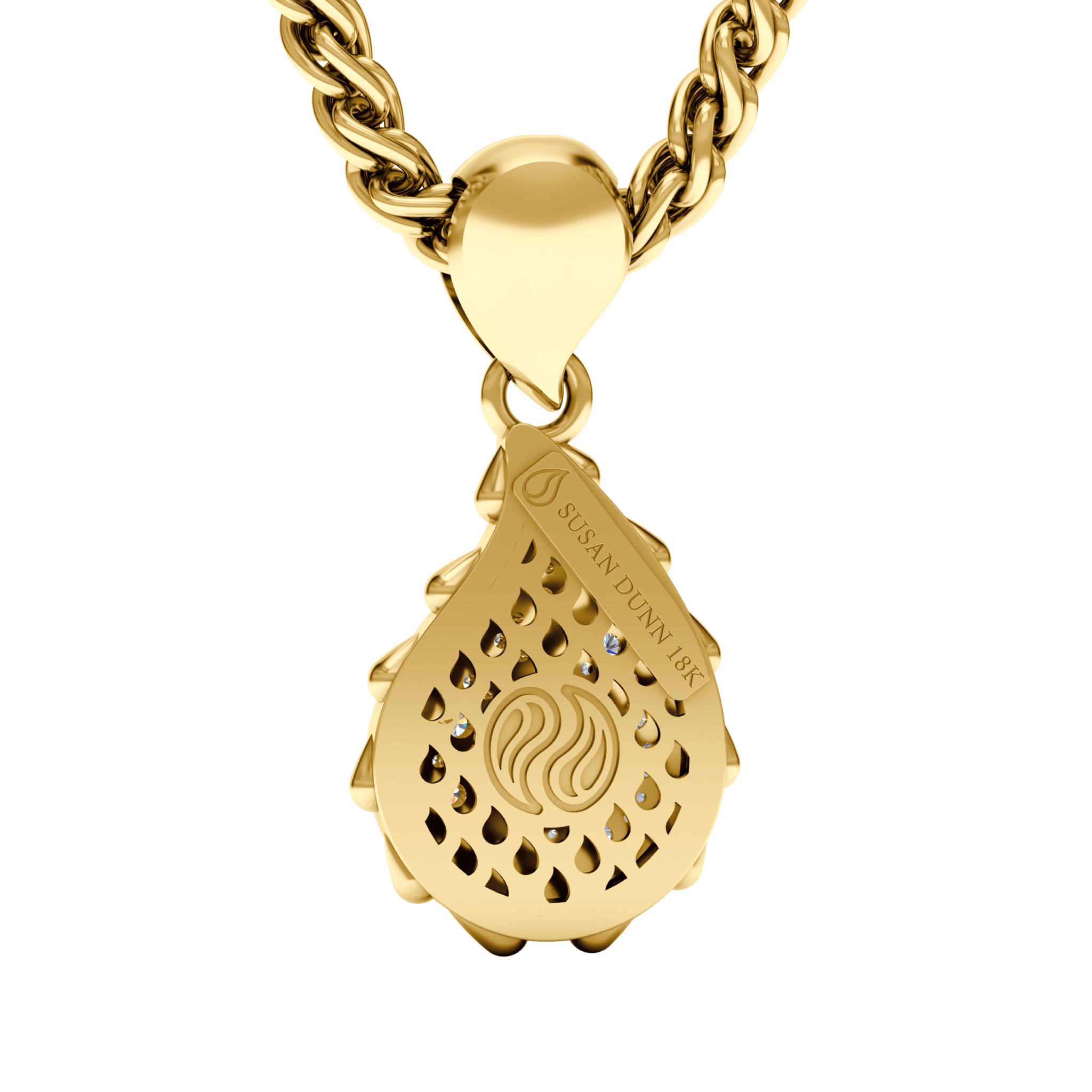 This Signature Grand Pendant is available in 18K Yellow ecological gold with Fairmined Certification and encrusted with diamonds of the finest DEF, VVS quality, responsibly mined and impeccably cut. This stunning delight is one-of-a-kind: individually cast, handset diamonds, meticulously hand finished and polished to perfection.